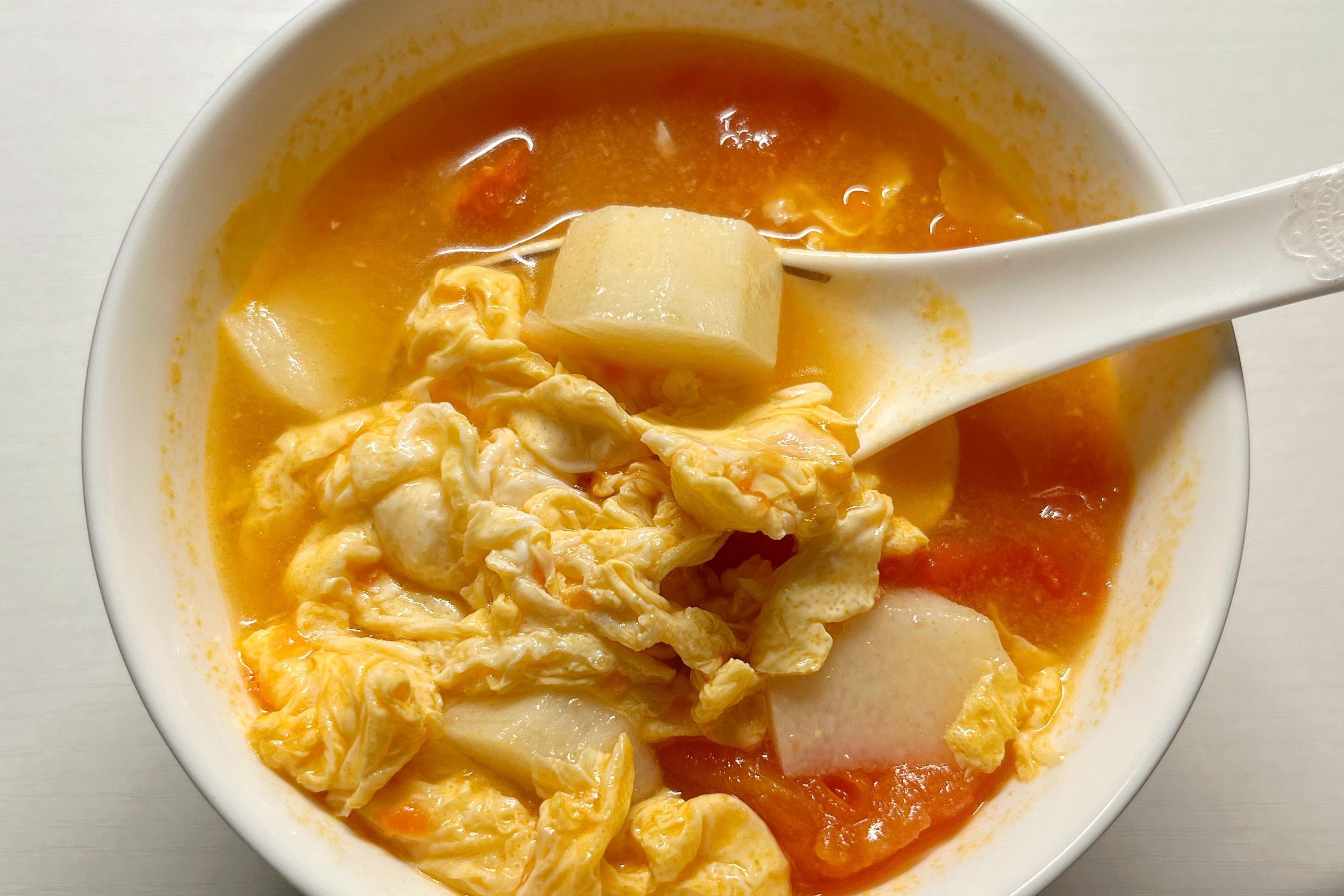 1、先準備下食材:山藥去皮切小塊,西紅柿切滾刀塊,雞蛋敲入碗中攪散;