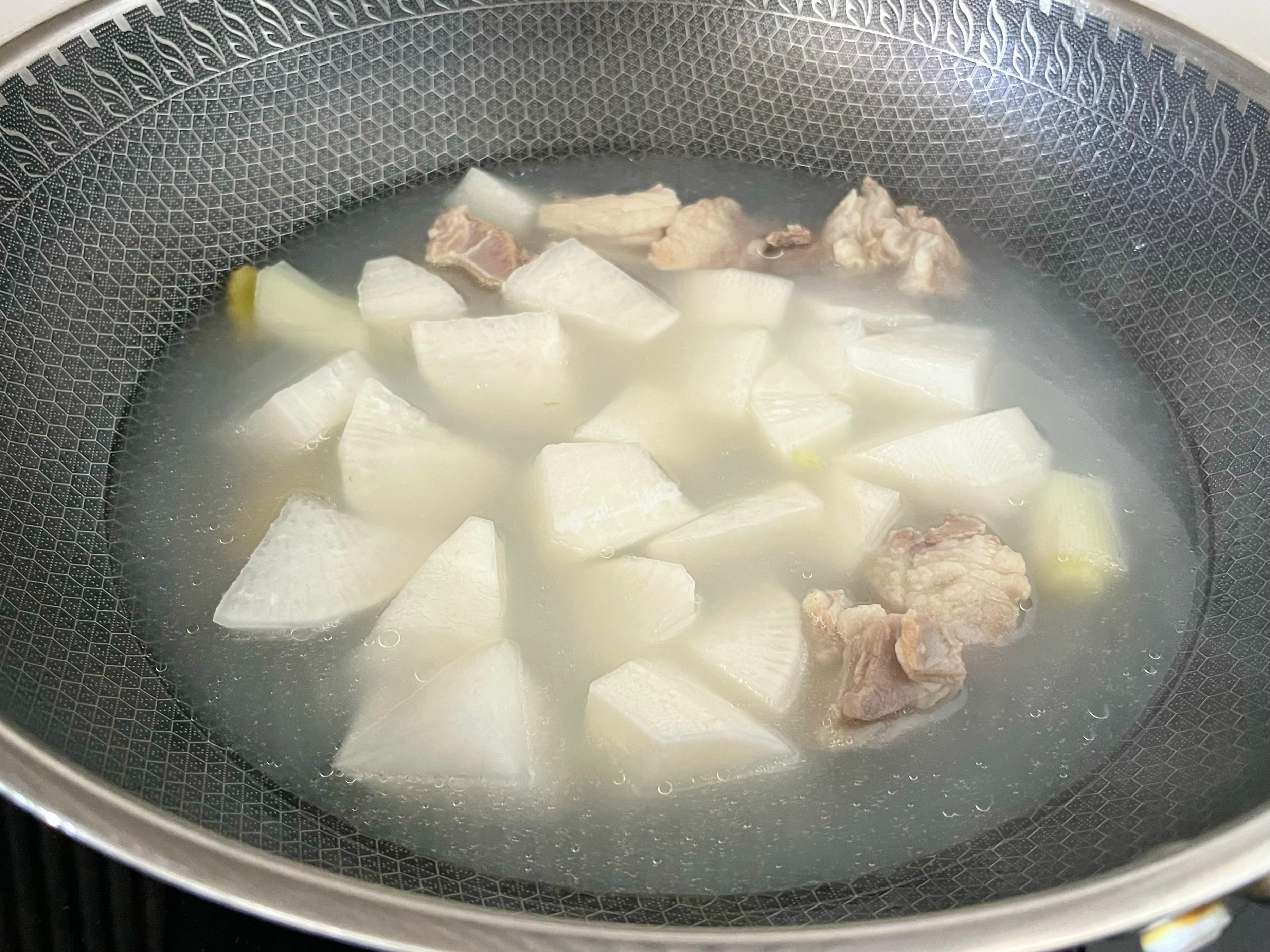 5、大火燉煮20分鐘,煮至羊湯開始變白,再加入蘿蔔;