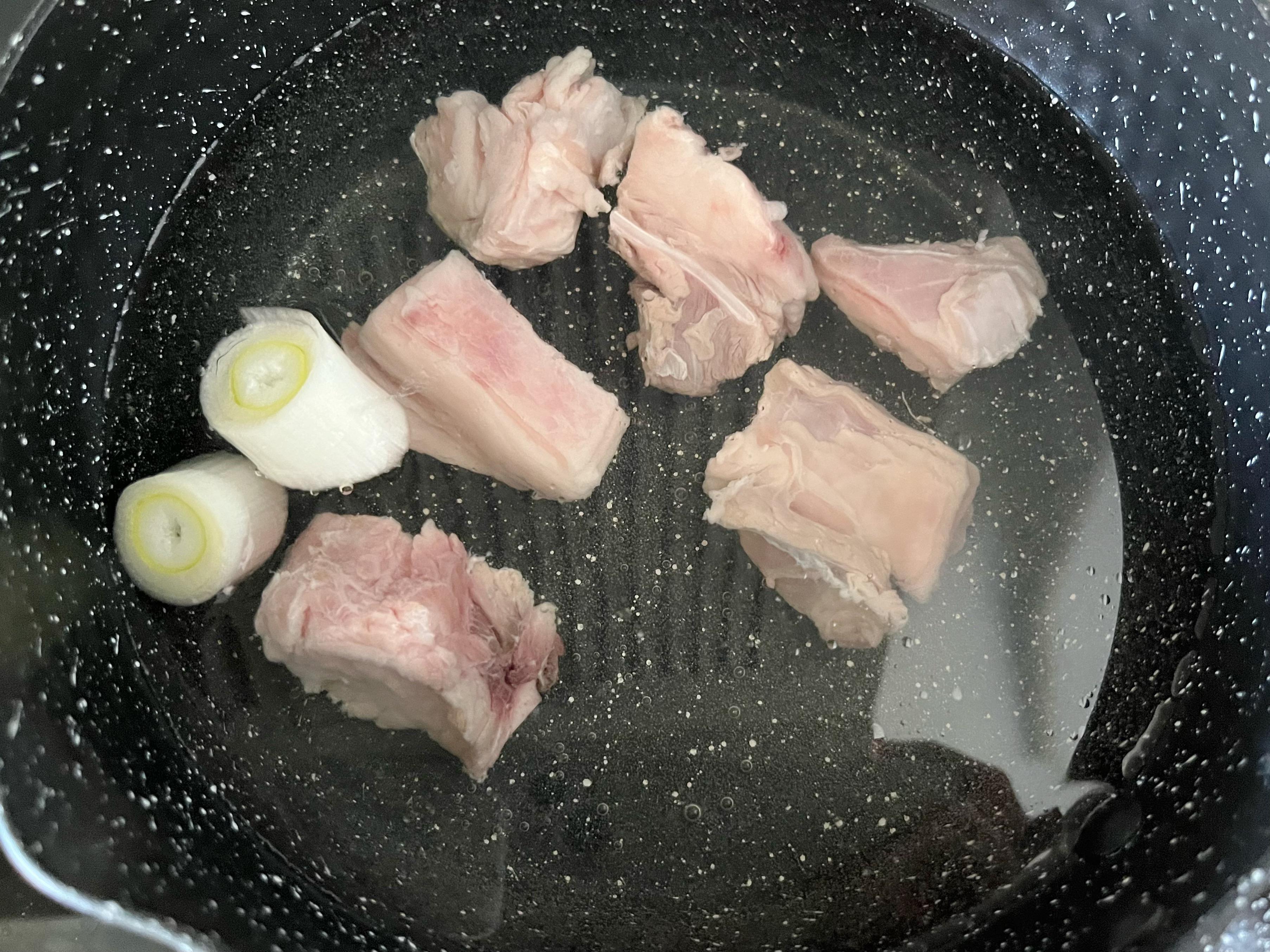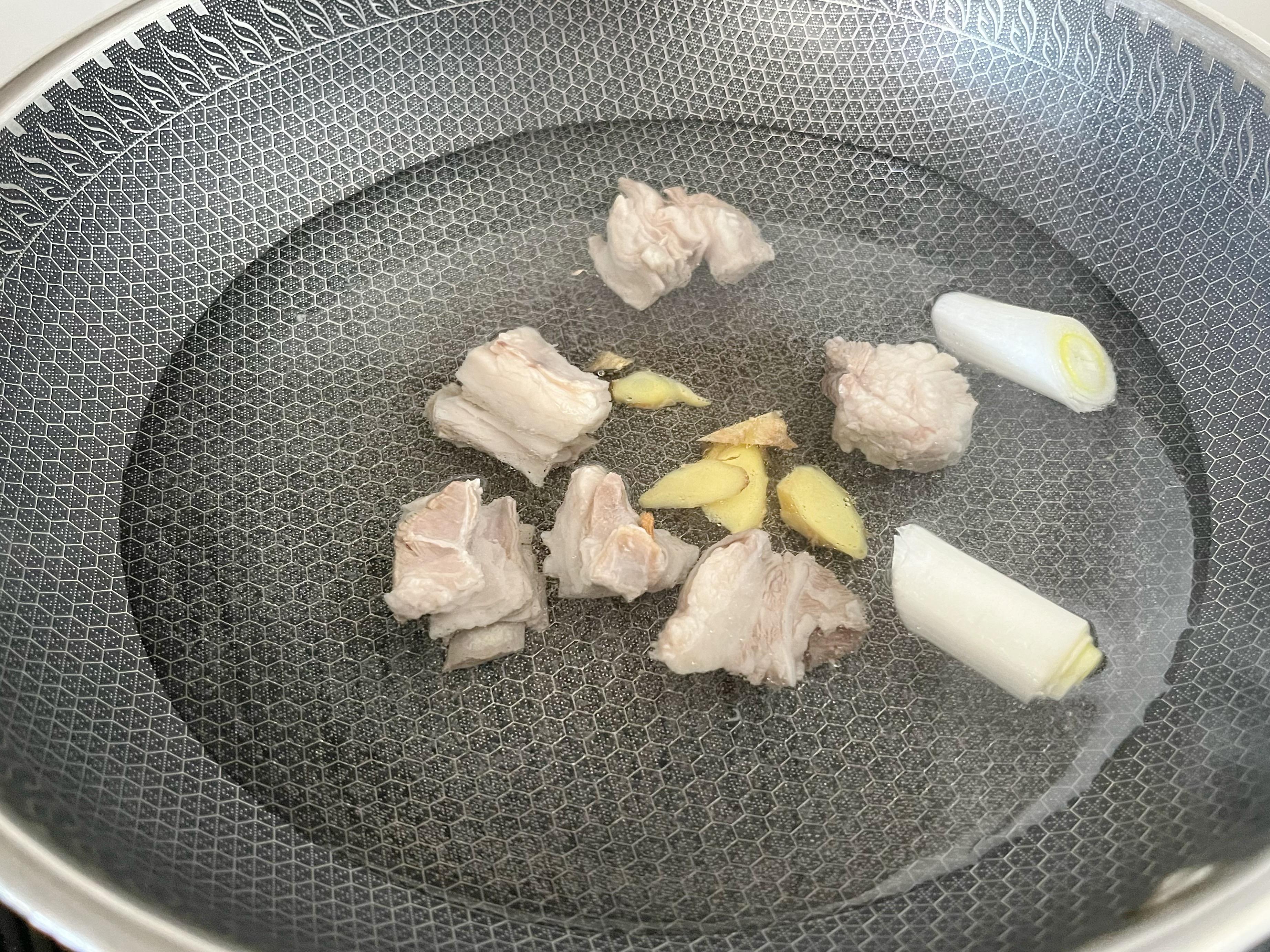 4、另起鍋燒水,水快開後,加入焯過水的羊排,再放些薑片、蔥白;