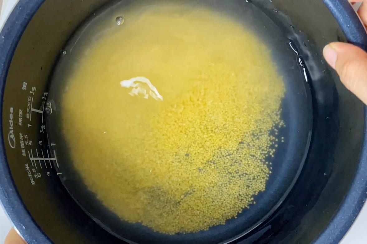 3、準備好小米,用清水沖洗幾遍,再加入鍋中,倒入足量清水;