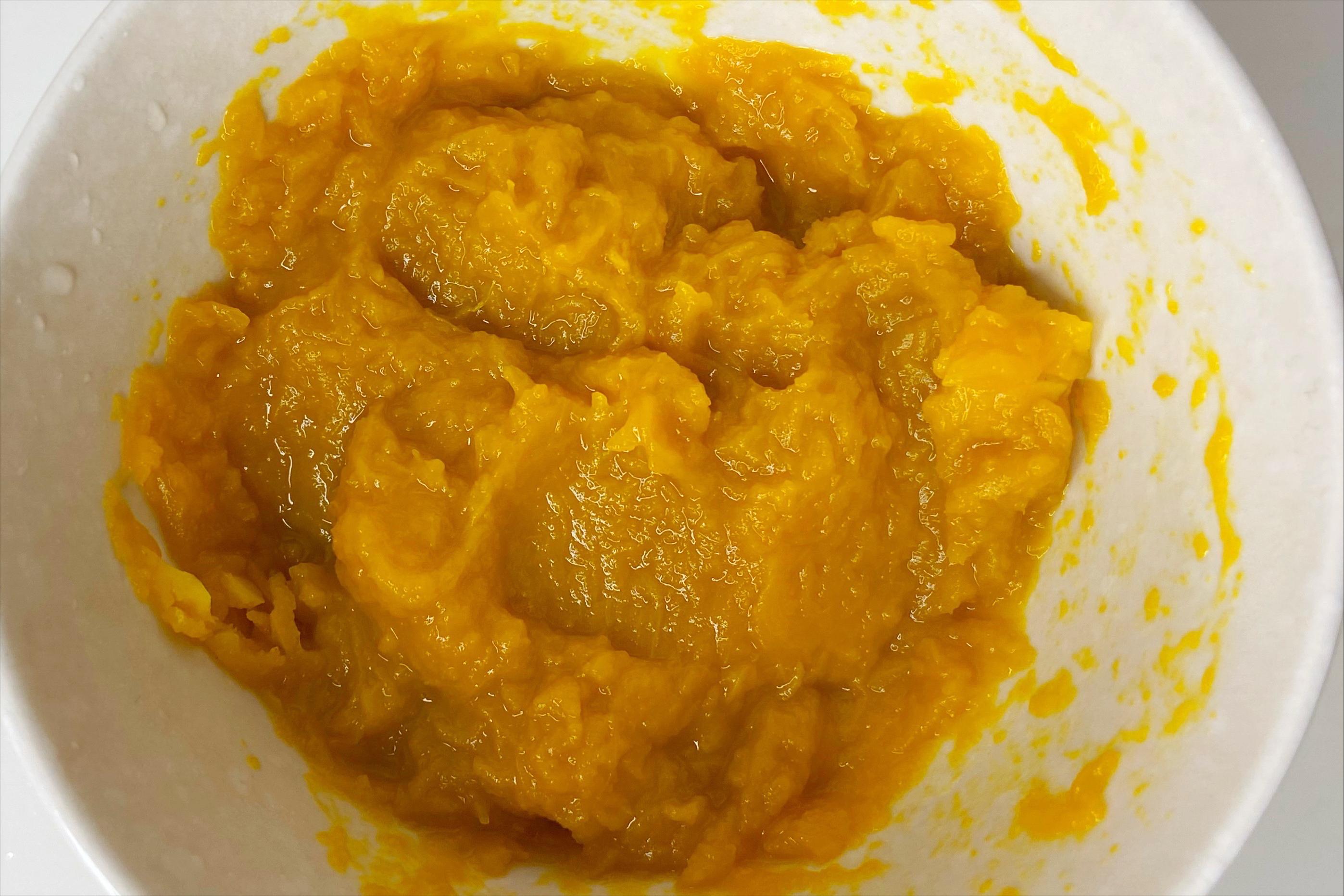 2、將蒸好的南瓜取出來,放入碗中,用勺子壓成泥狀;