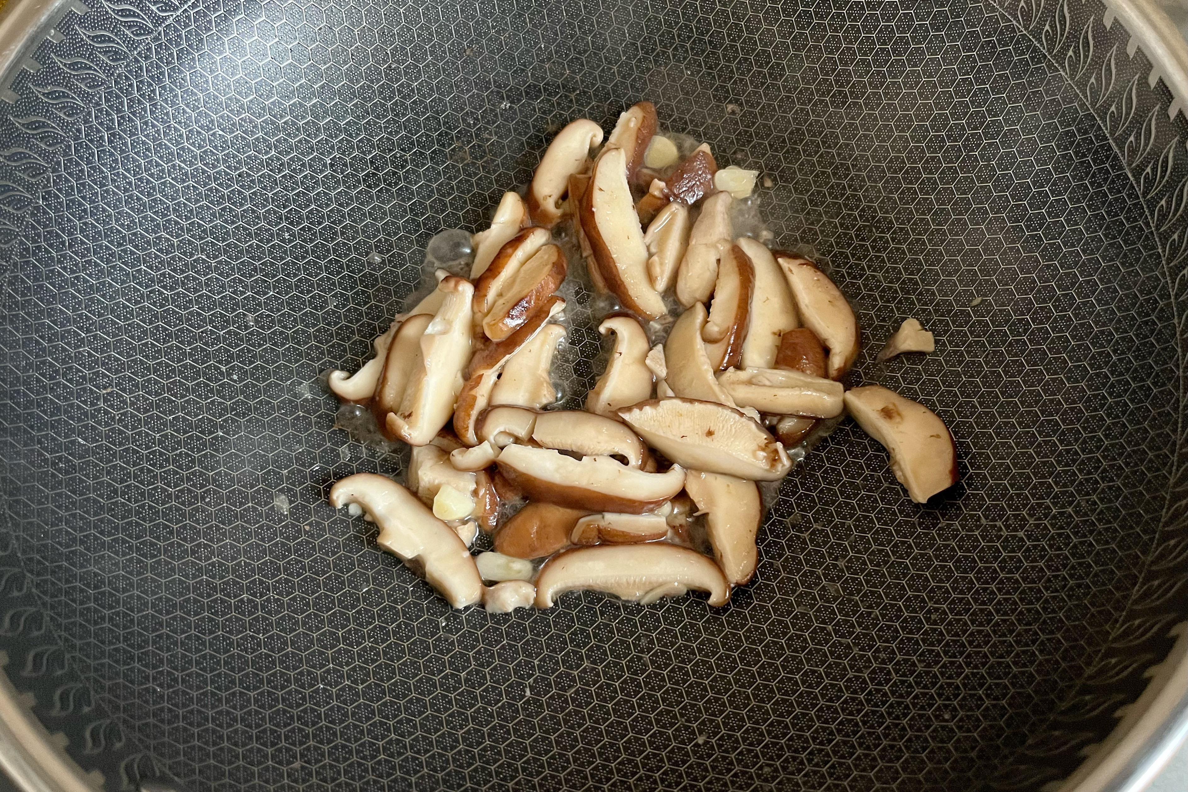 3、鍋中加油,先下些蒜末爆香,再加入香菇,翻炒3分鐘,至香菇變熟軟,炒的過程中,可以加1小勺清水;