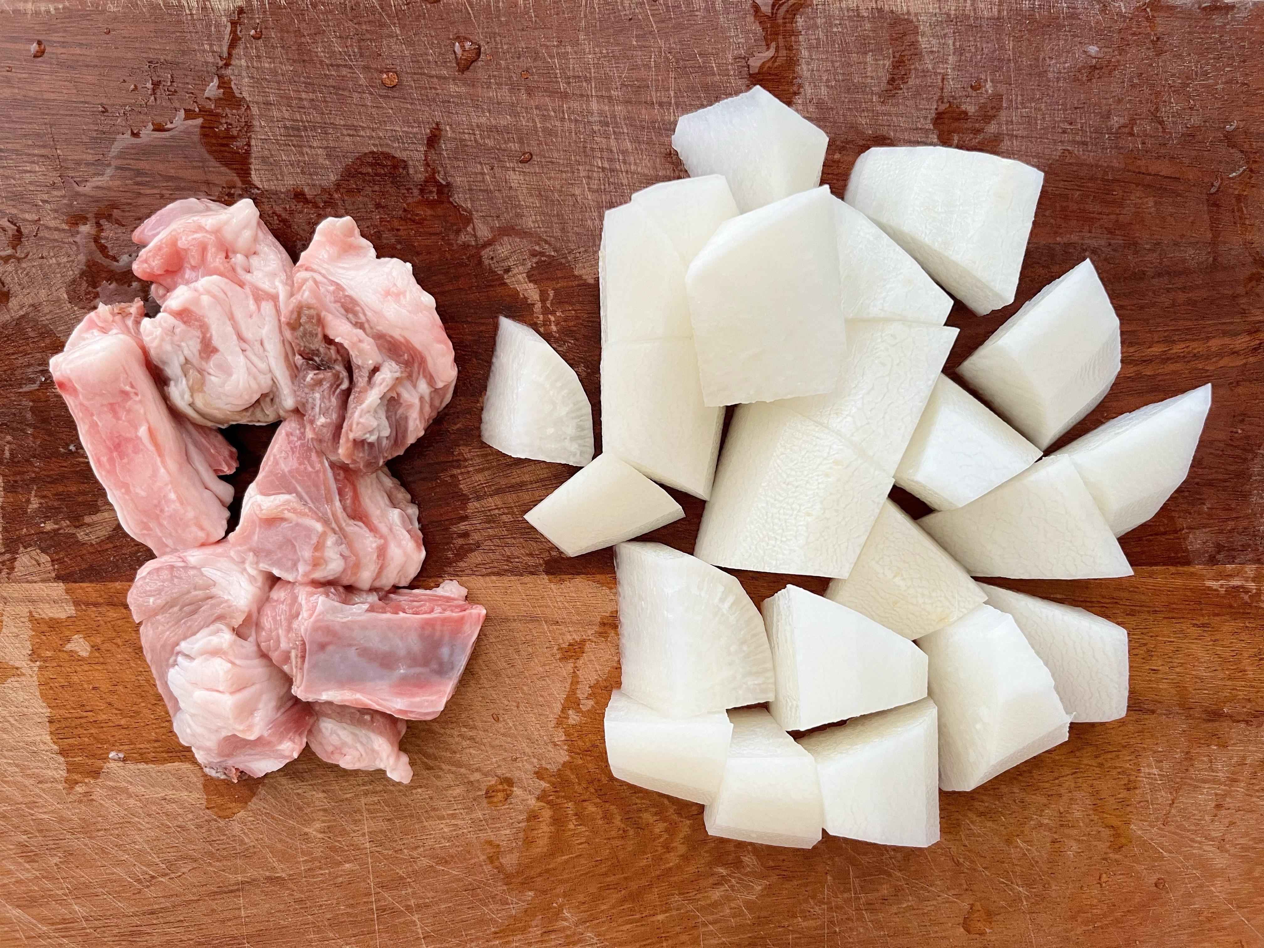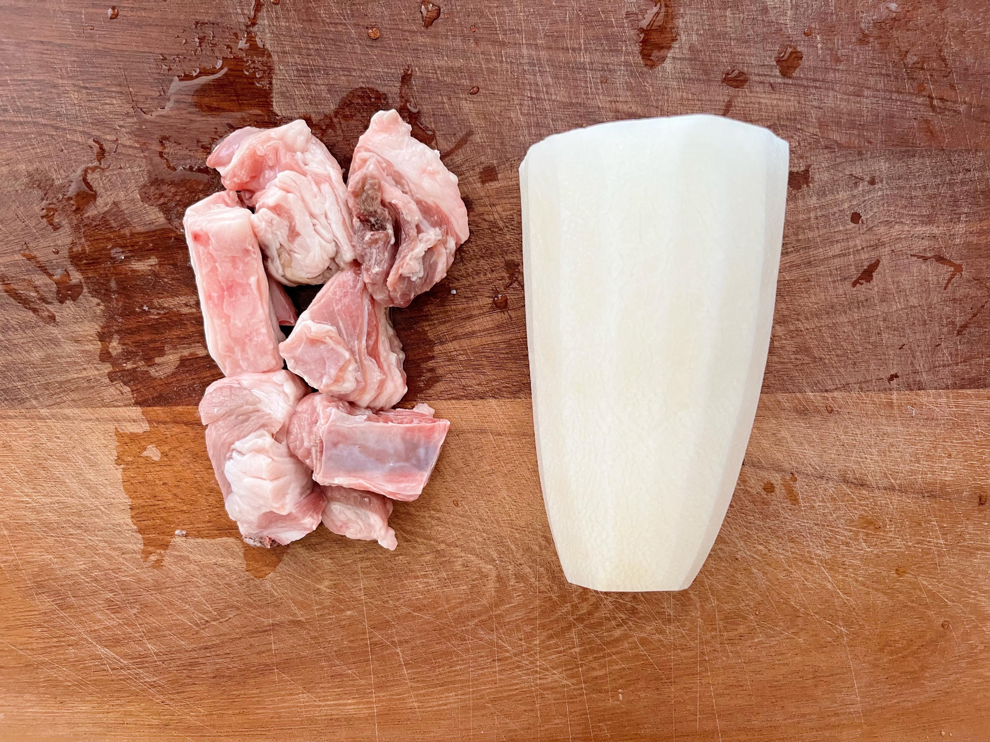 1、準備好烹製這道菜要用的主料:新鮮的羔羊排、脆嫩的白蘿蔔;
