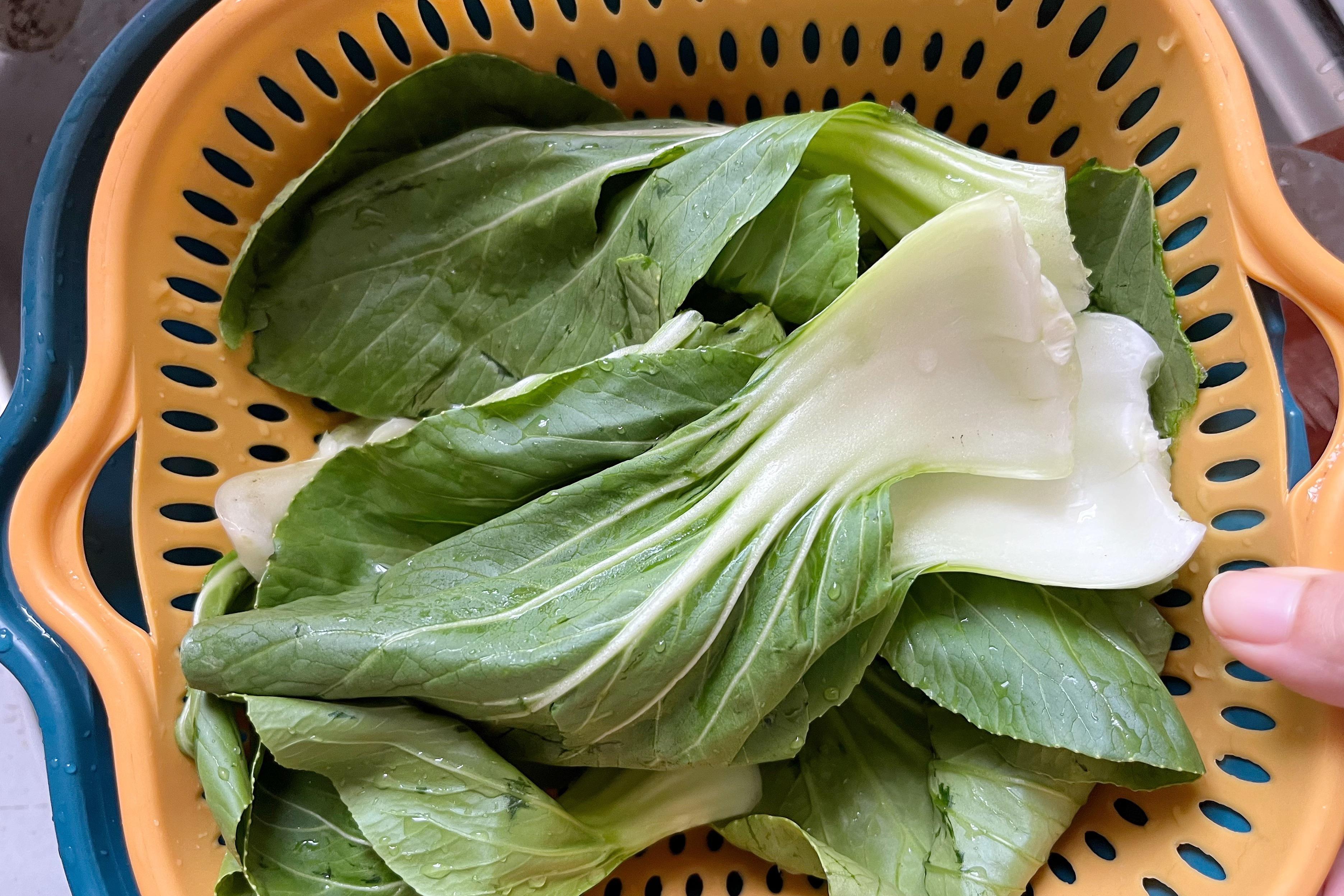 2、上海青一片片掰開,用流動的清水洗乾淨,控幹水分備用;