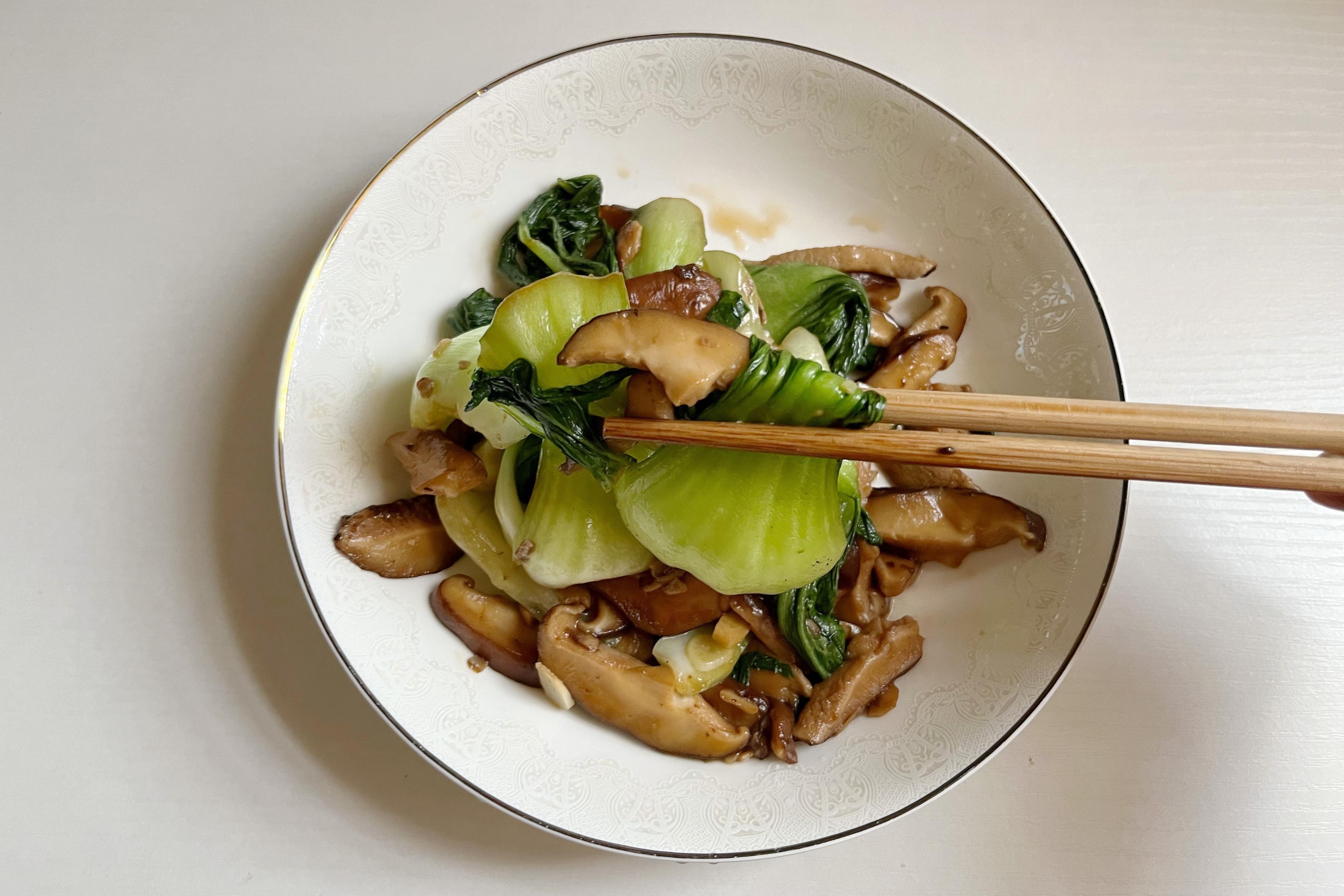 5、不斷翻炒均勻後,即可盛盤上桌,香菇鮮美,上海青脆爽,特別下飯。