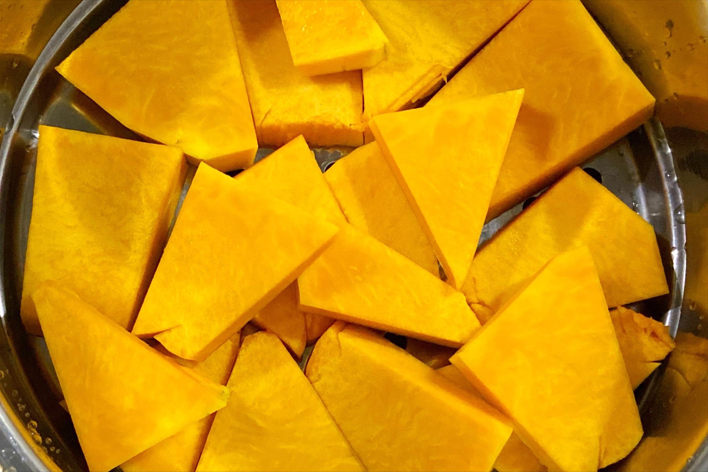 1、南瓜去皮、切小塊,先放入蒸鍋中,隔水蒸20分鐘,蒸至熟軟;