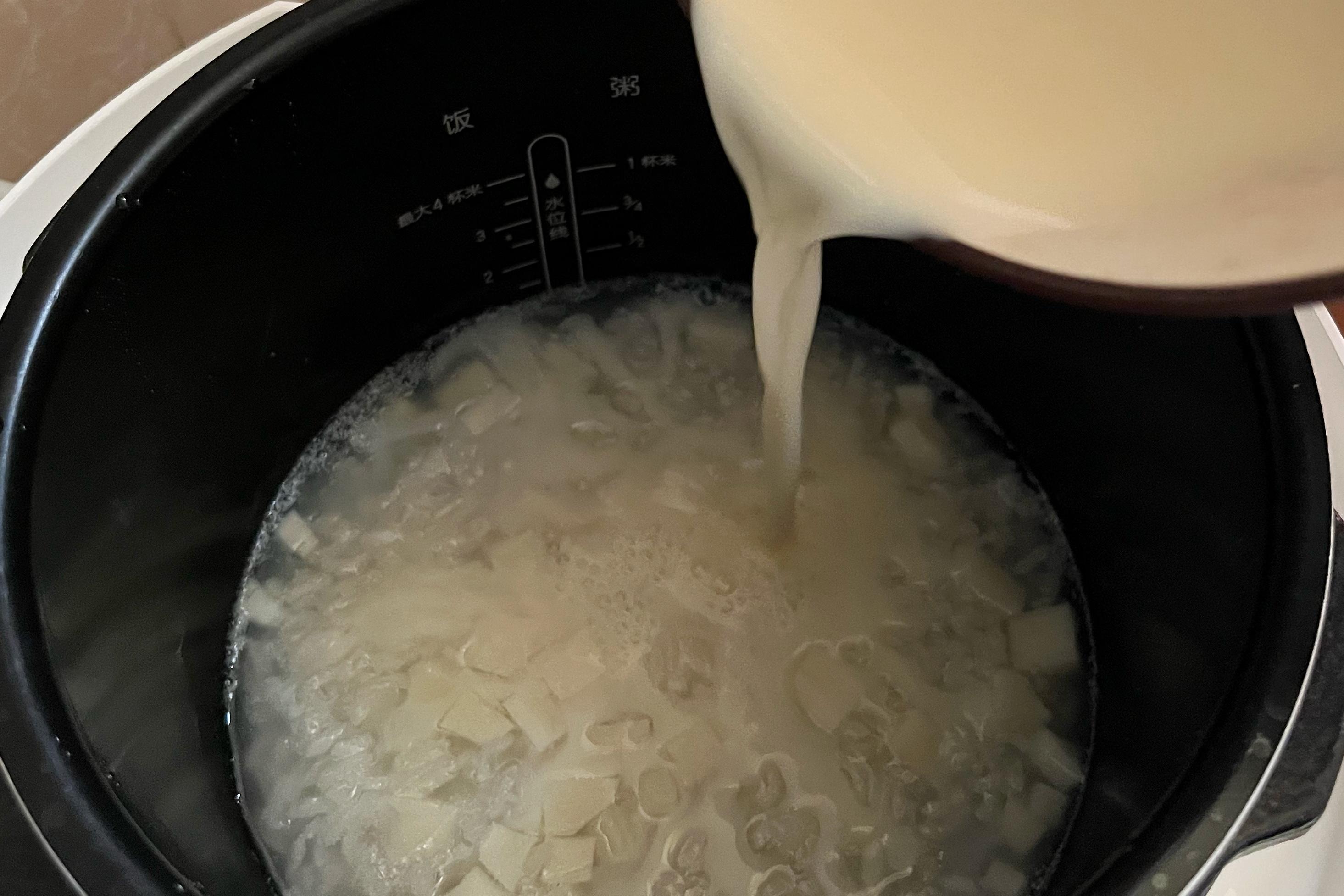 4、等粥熬好後,將豆漿倒入鍋中,不斷攪拌均勻;