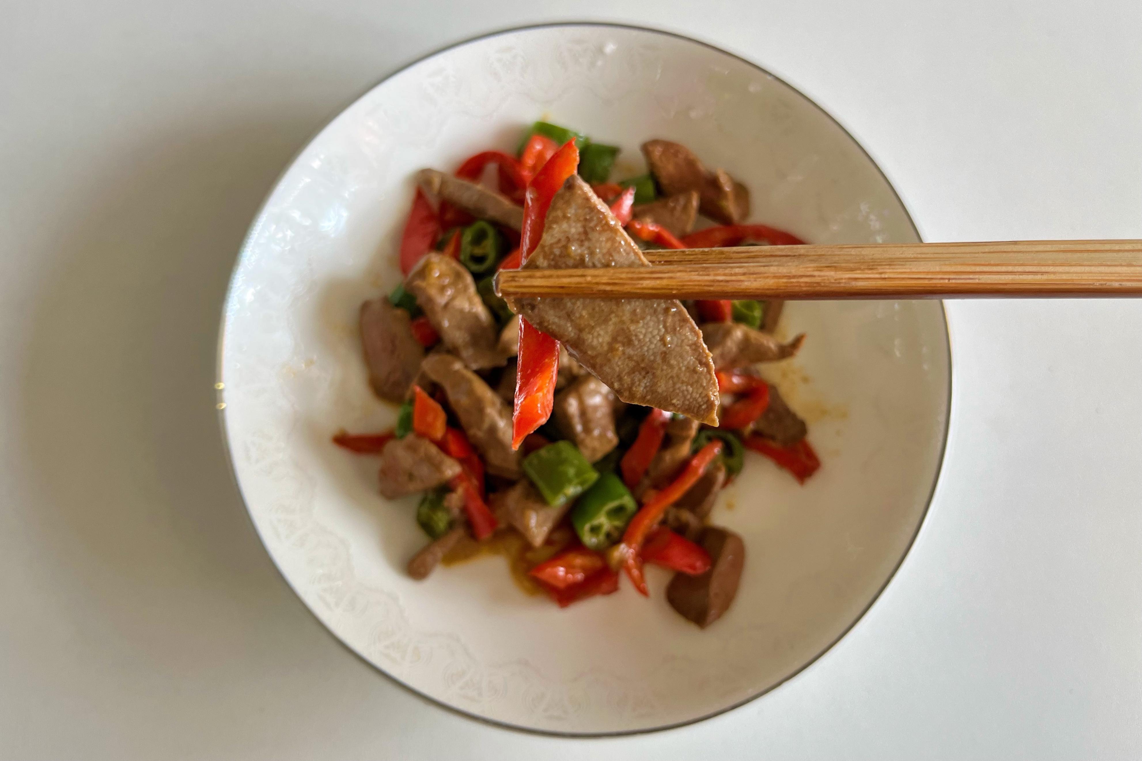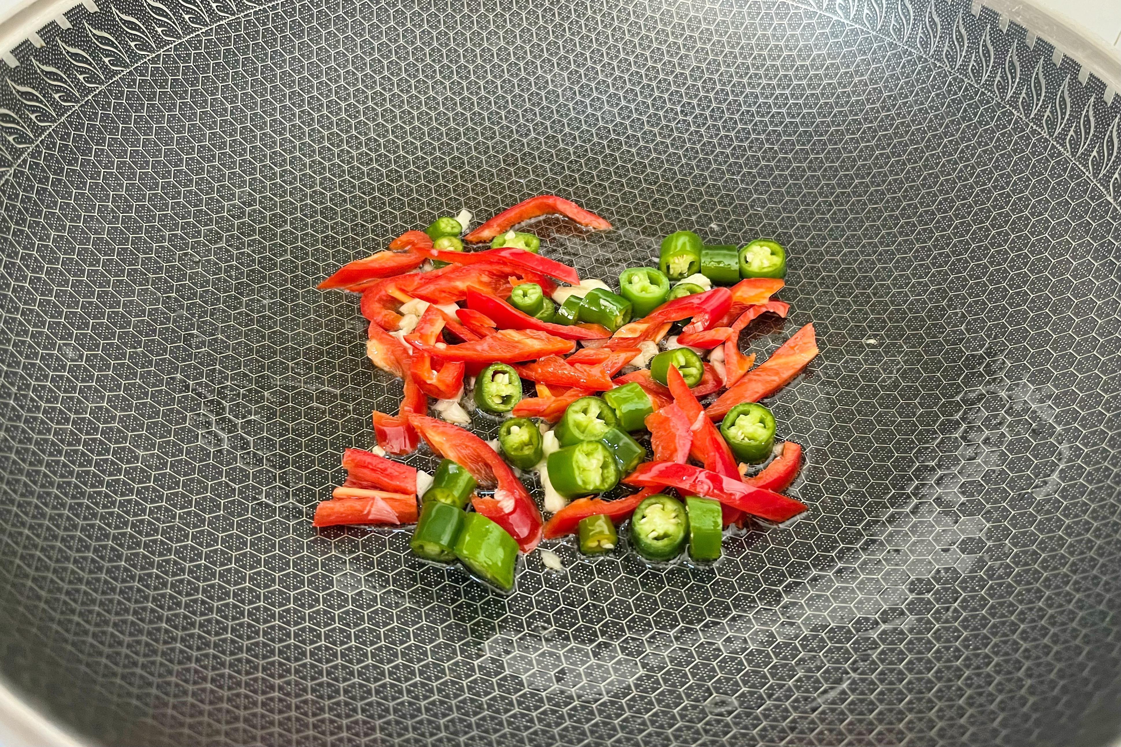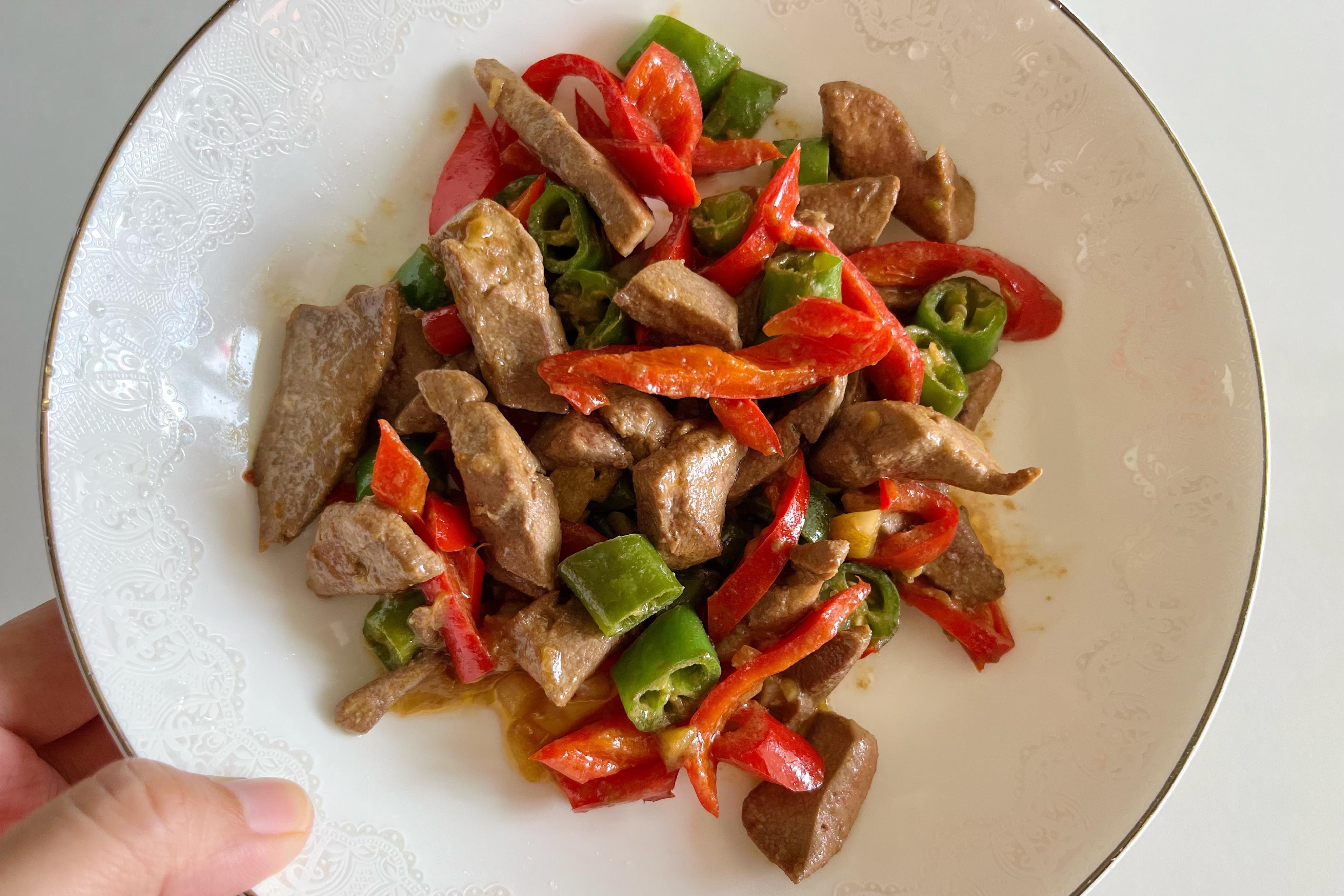 3、青、紅辣椒切小塊,下油鍋中翻炒1分鐘,再加入豬肝;