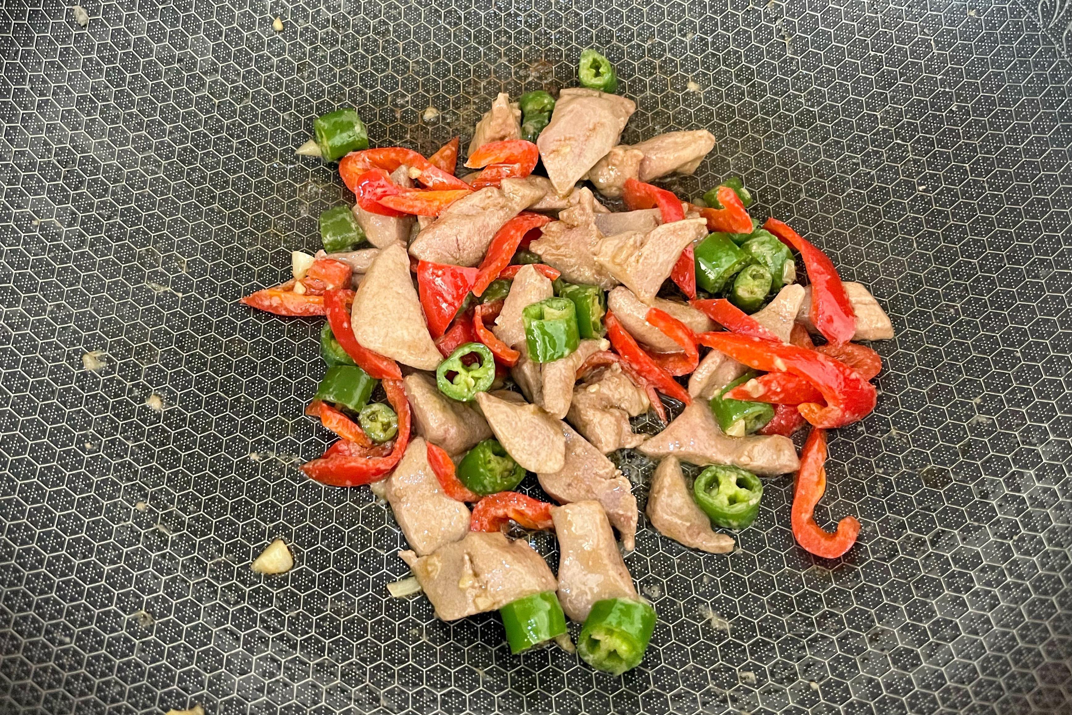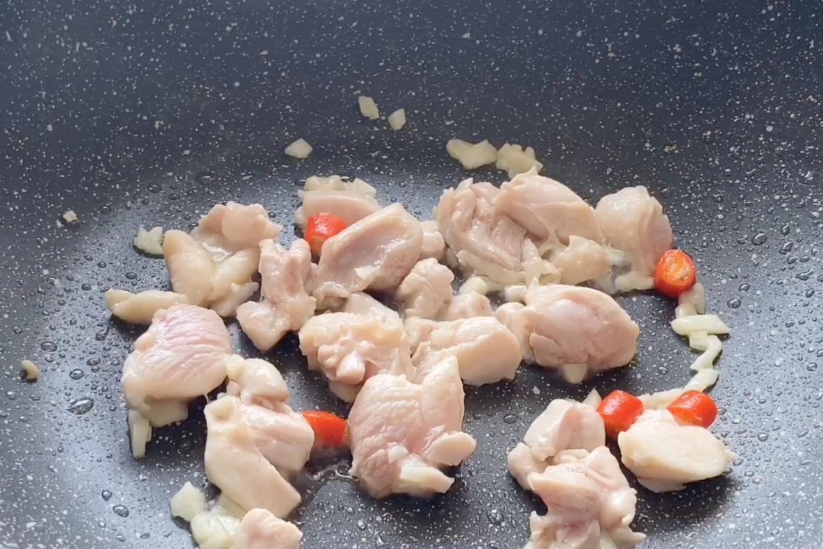4、鍋中加油,下蒜末、小米辣炒香,再倒入雞腿肉,不斷翻炒至肉變色;