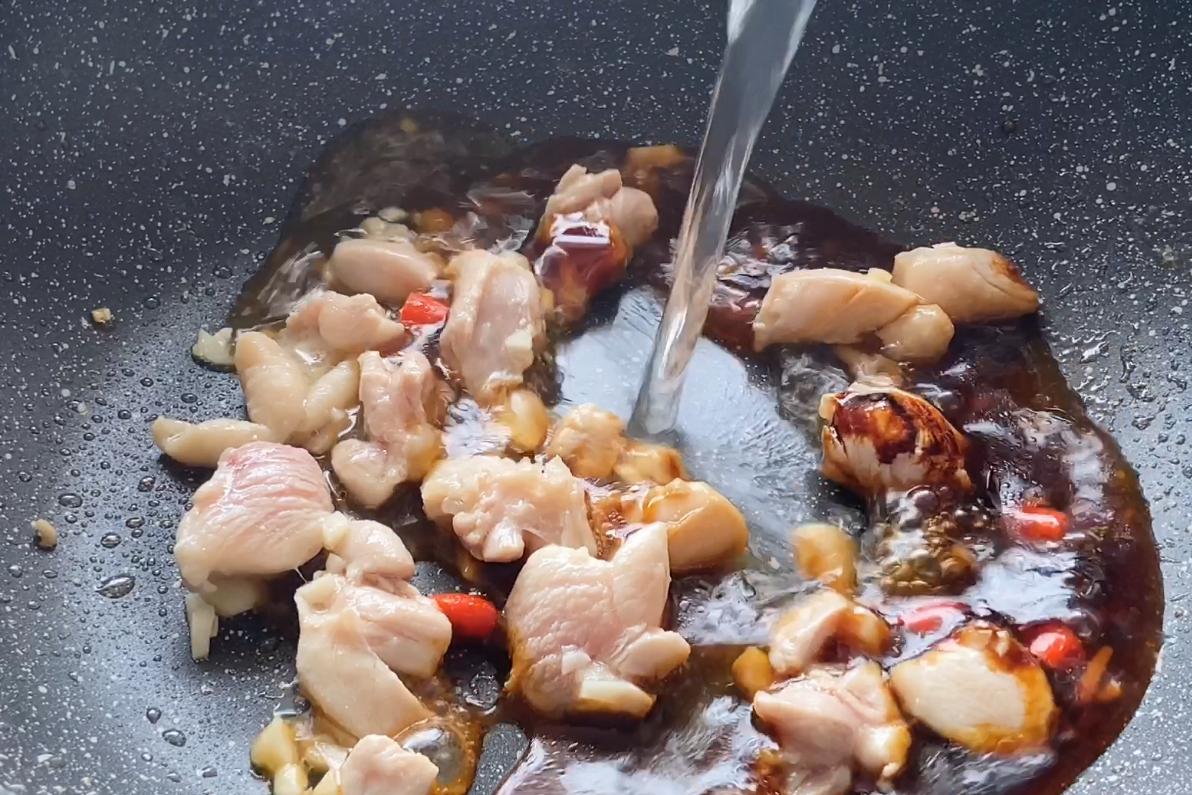 5、往鍋中加些生抽、蠔油、少許老抽炒勻,再加入適量清水,能沒過雞肉一半即可;