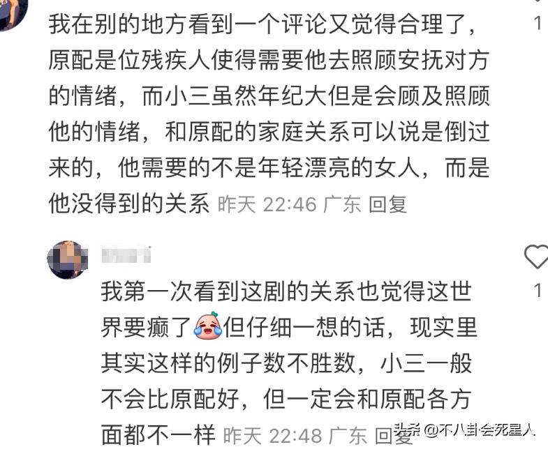 接着,很多網友在評論區分享了身邊男性出軌年紀比自己大,甚至已經是中老年女性的例子,大家才發現,這部劇纔是“現實寫照”。