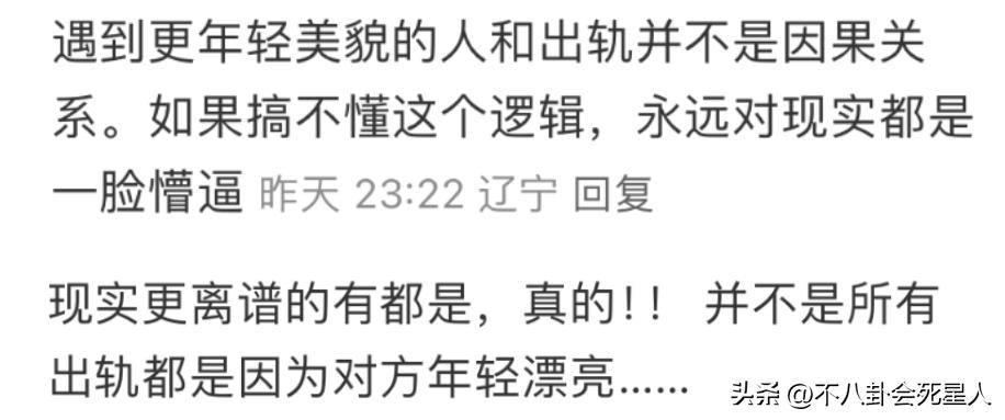 網友的見解是,年輕貌美和出軌不是因果關係,現實中並不是所有出軌都是因爲對方年輕漂亮。