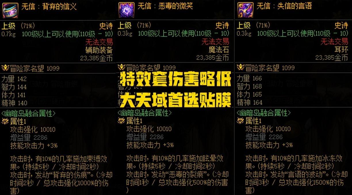 也就是傳說中的“特效套”,但即便不算特效傷害,無信系列也超越了其他貼膜,如果不想減少藍量,可以選擇這套。