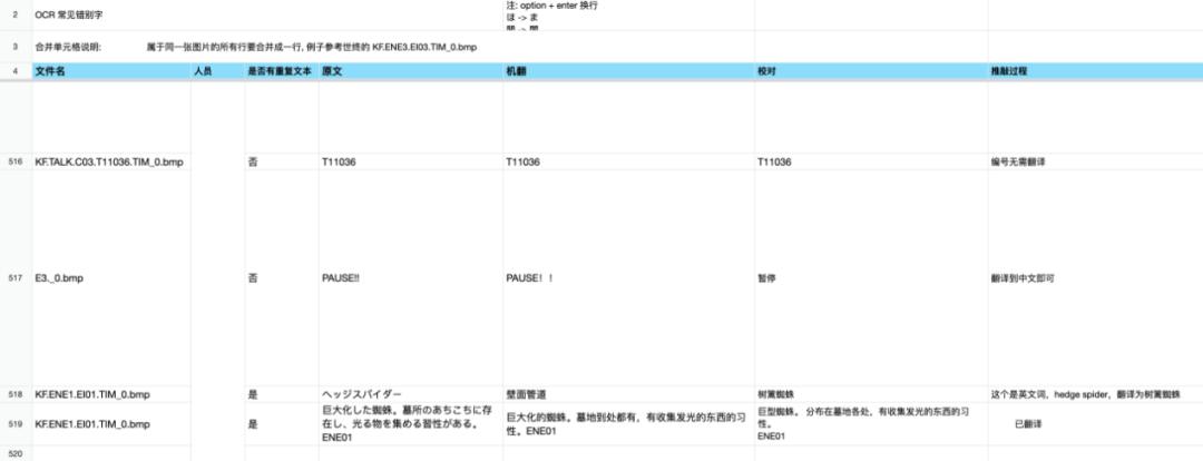 這也就有了過去幾個月的故事,一夥人開始速通《標準日本語》,倒也不必學得多麼完備,能看懂最基本的平假名片假名,再掌握基礎的語法即可。互聯網時代,不懂的東西可以隨時上網查,更何況這是個由83人組成的大型團隊,每天的工作都會實時同步至內部表格,所有人都能方便地檢閱譯文,很大程度上減少了錯譯漏譯的可能性。