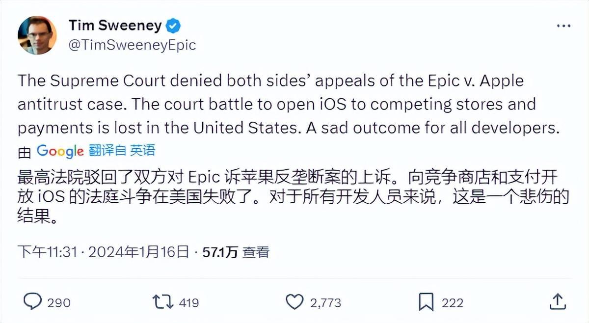 Epic的CEO蒂姆•斯威尼(Tim Sweeney)在X上失望地表示:“針對iOS平臺的競爭性商店和支付手段的法庭鬥爭,在美國失敗了。對於所有開發人員來說,這是一個悲傷的結果。”