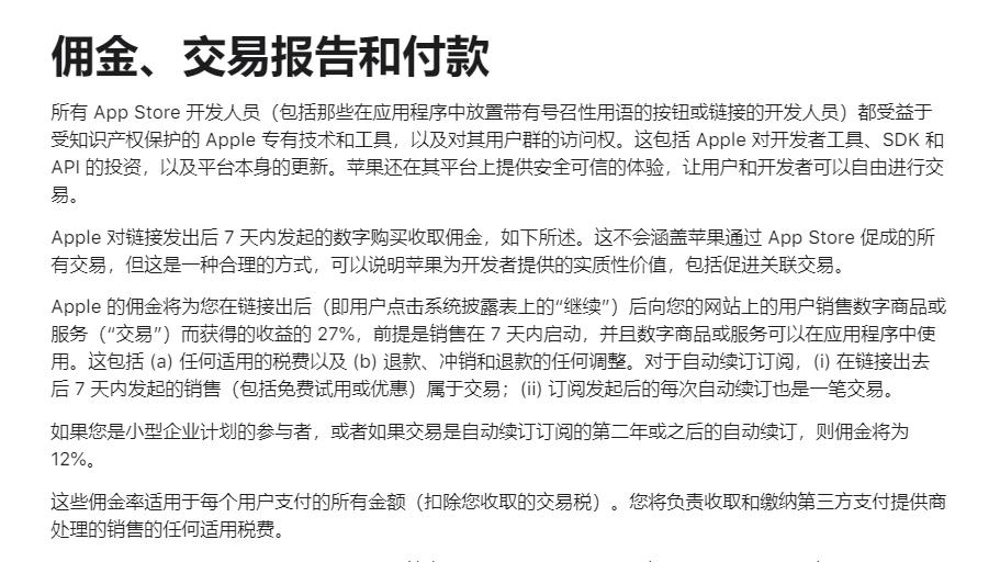 但是,根據蘋果的新規,即便採用非iOS支付方式銷售數字商品或服務,蘋果仍然有權收取這部分收益的27%份額。蒂姆將這27%份額稱作“蘋果稅”,還認爲蘋果的新規屬於惡意合規,扼殺了價格競爭,“完全破壞了秩序”。