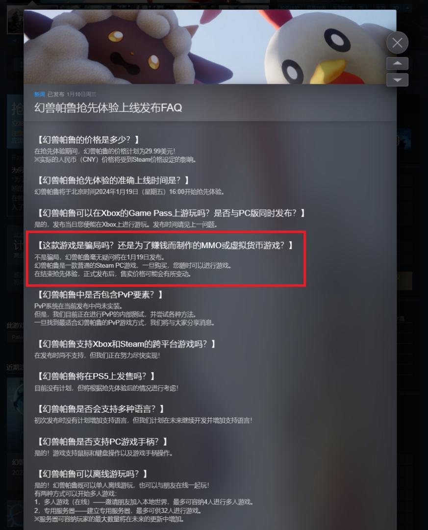 有玩家發現,官方在1月10日發佈的一則FAQ中自問自答:“這款遊戲是騙局嗎?還是爲了賺錢而製作的MMO或虛擬貨幣遊戲?不是騙局,《幻獸帕魯》是一款普通的Steam和PC遊戲,一旦購買,您隨時可以進行遊戲。”