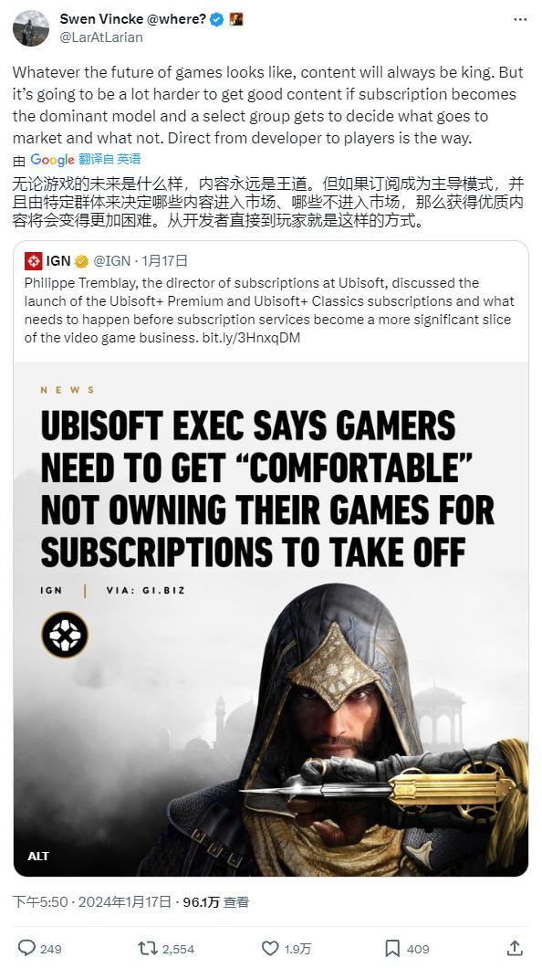 這一觀點激起了社交媒體上的廣泛討論,《博德之門3》開發商拉瑞安工作室的創始人斯文•文克(Swen Vincke),也參與了進來。他在X(前推特)上發表評論抵制訂閱服務,還明確指出,訂閱制服務的興起很可能產生總體上的負面影響。