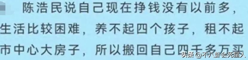 同樣哭窮惹來爭議的,還有陳浩民。他在某採訪中說現在掙錢沒以前多,租不起市中心的大房子,只能搬回自己4千萬買的便宜別墅。