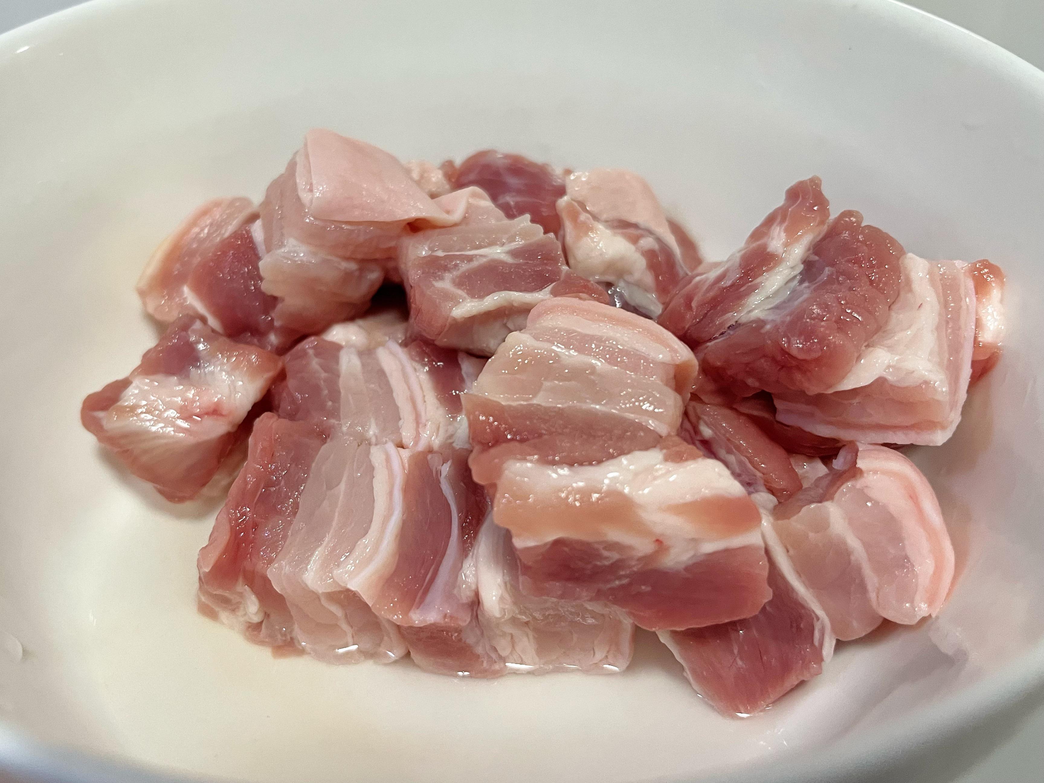 1、準備一些漂亮的五花肉,洗淨後冷水下鍋,加些料酒、蔥段,煮出浮沫後撈出來洗淨;