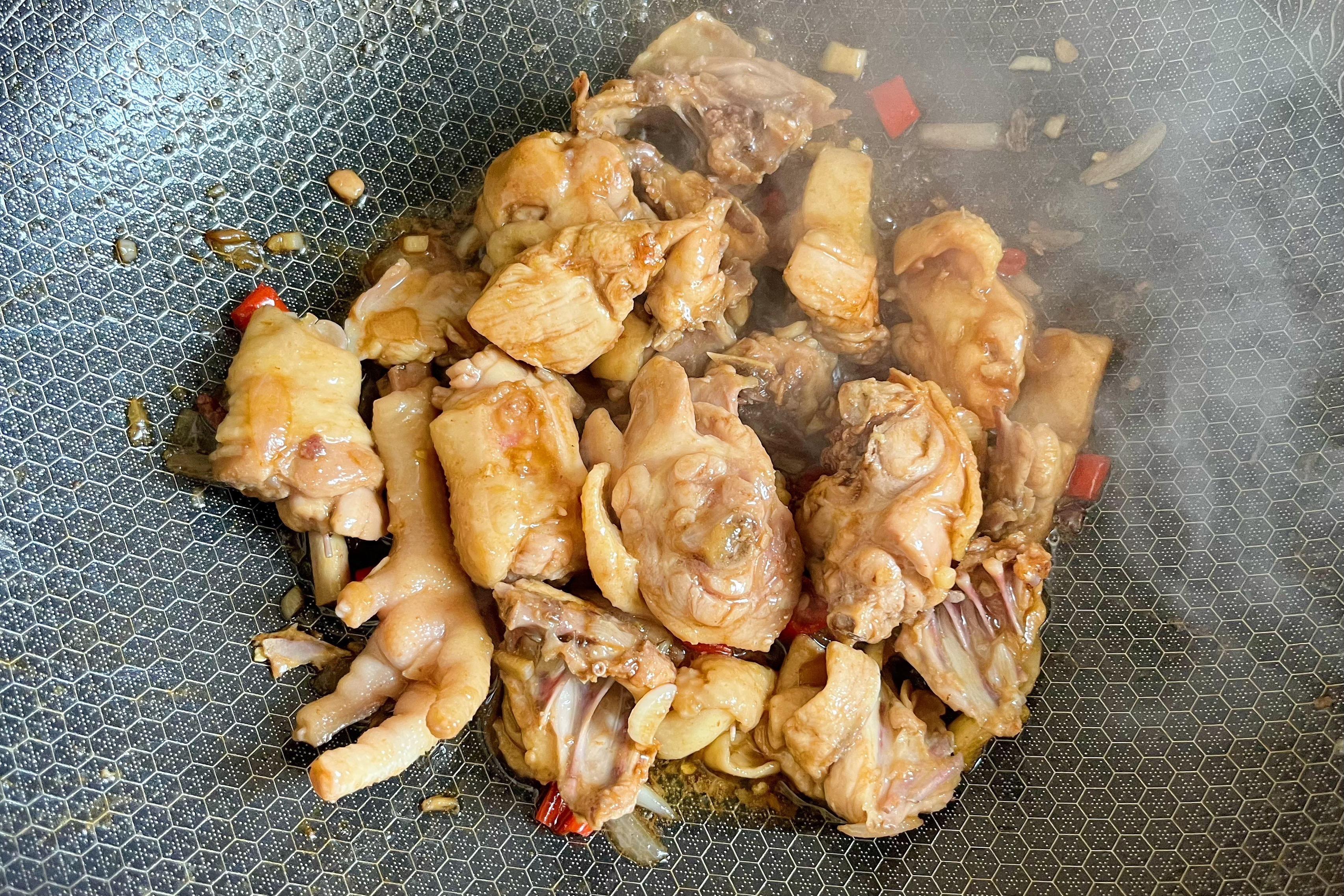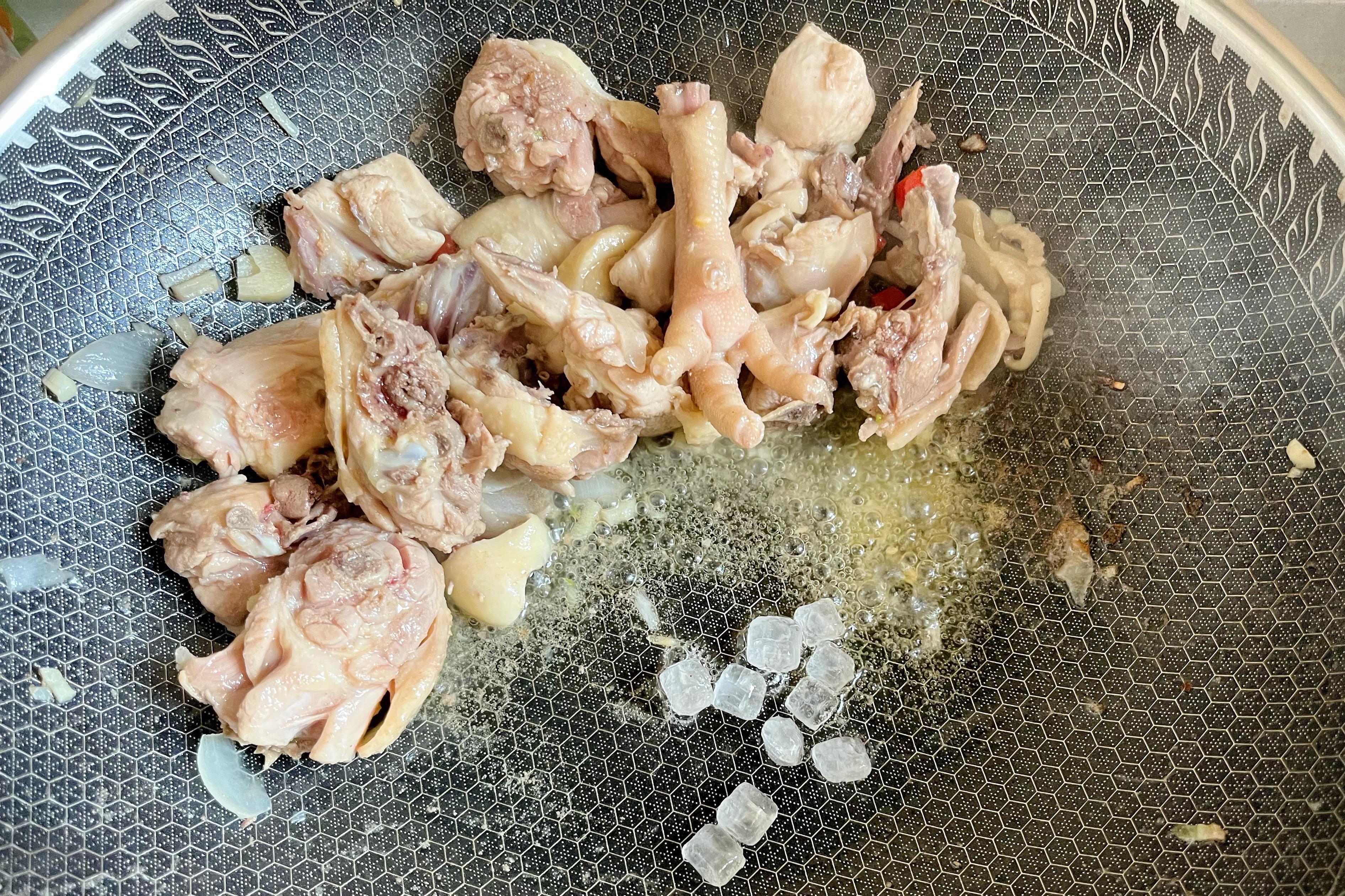 3、不斷翻炒至雞肉出油後,放些冰糖進去炒化,再和雞肉混合在一起;