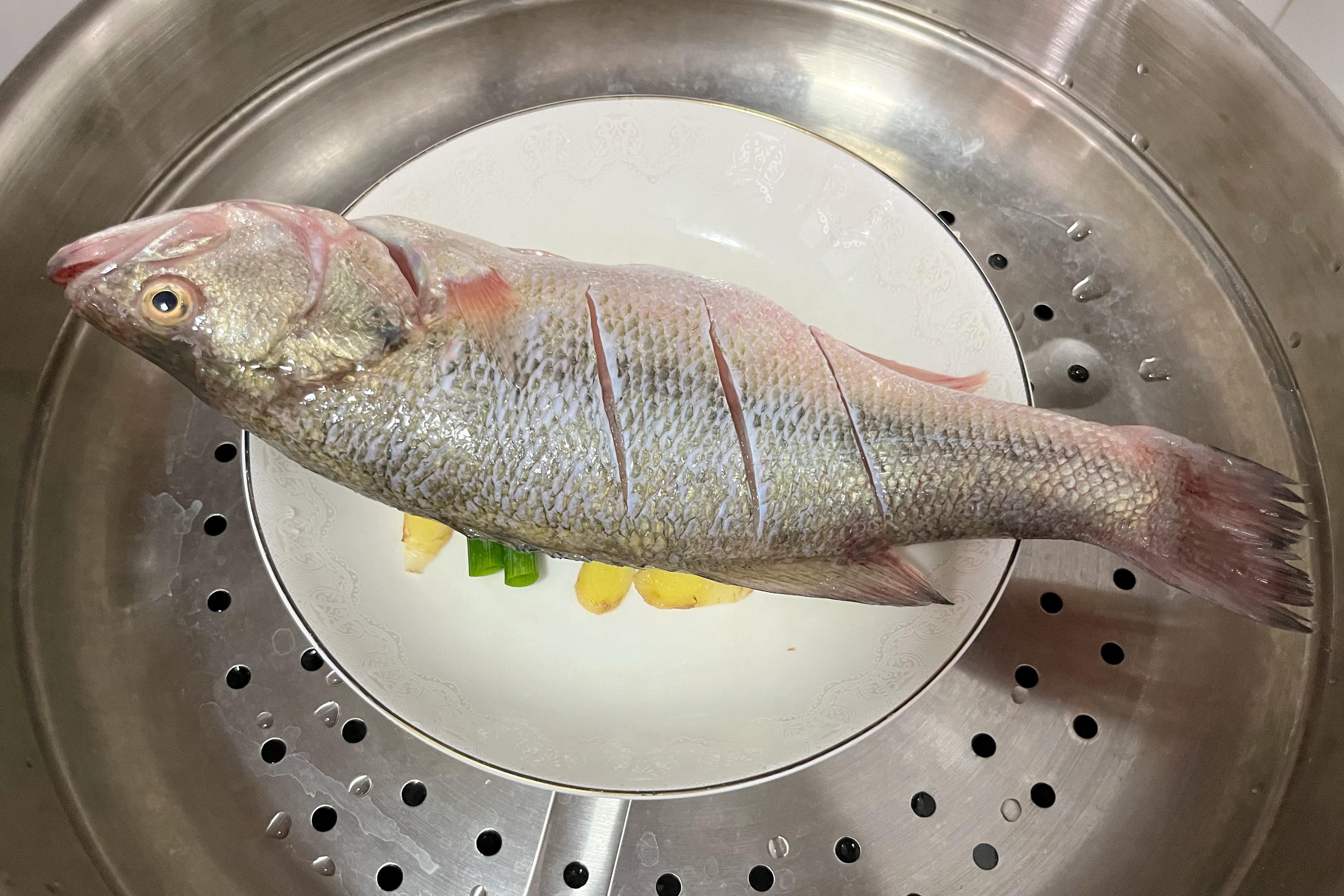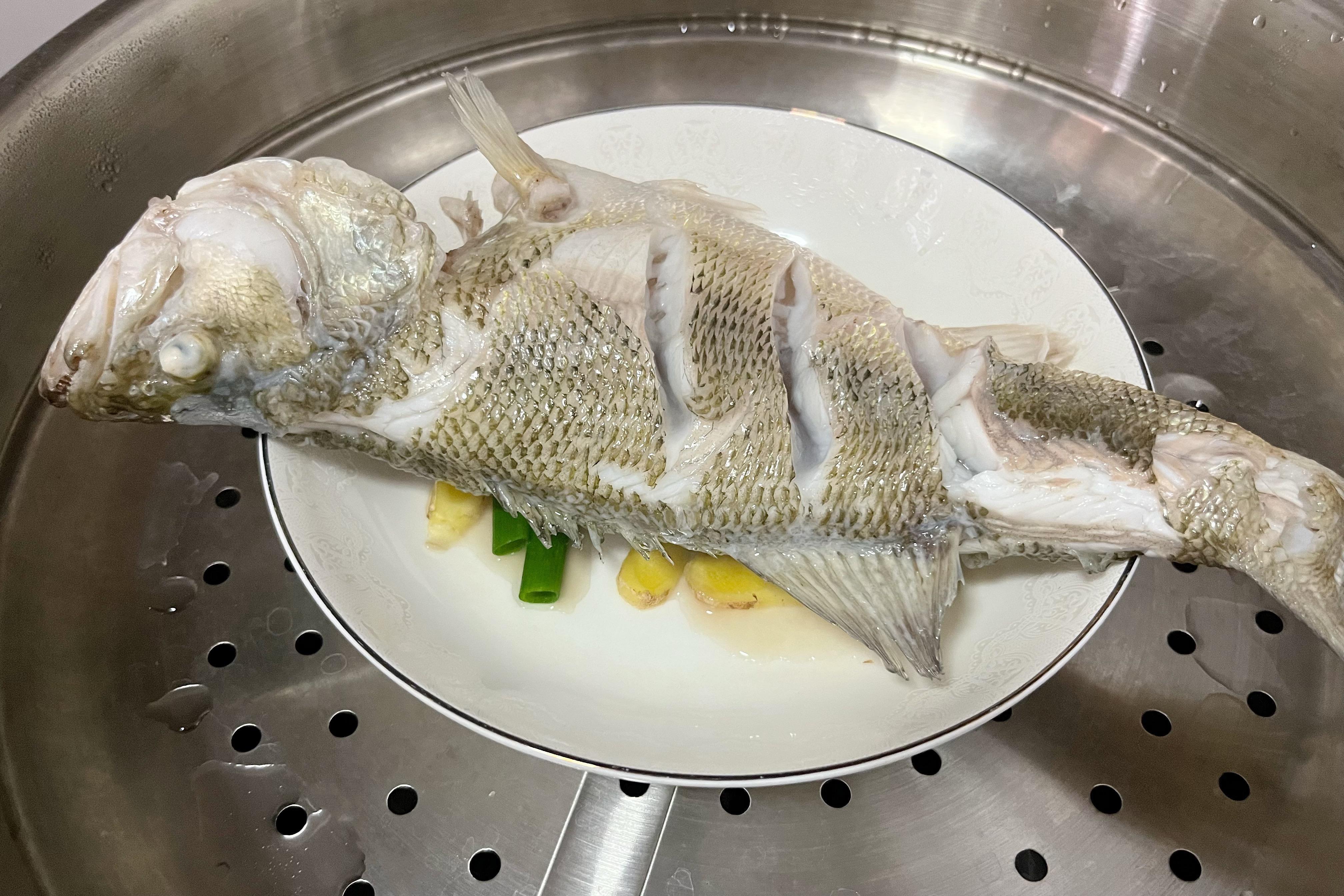 2、蒸盤底部墊上蔥段、薑片,將醃製好的鱸魚放上去,再將蒸盤放入蒸鍋中;