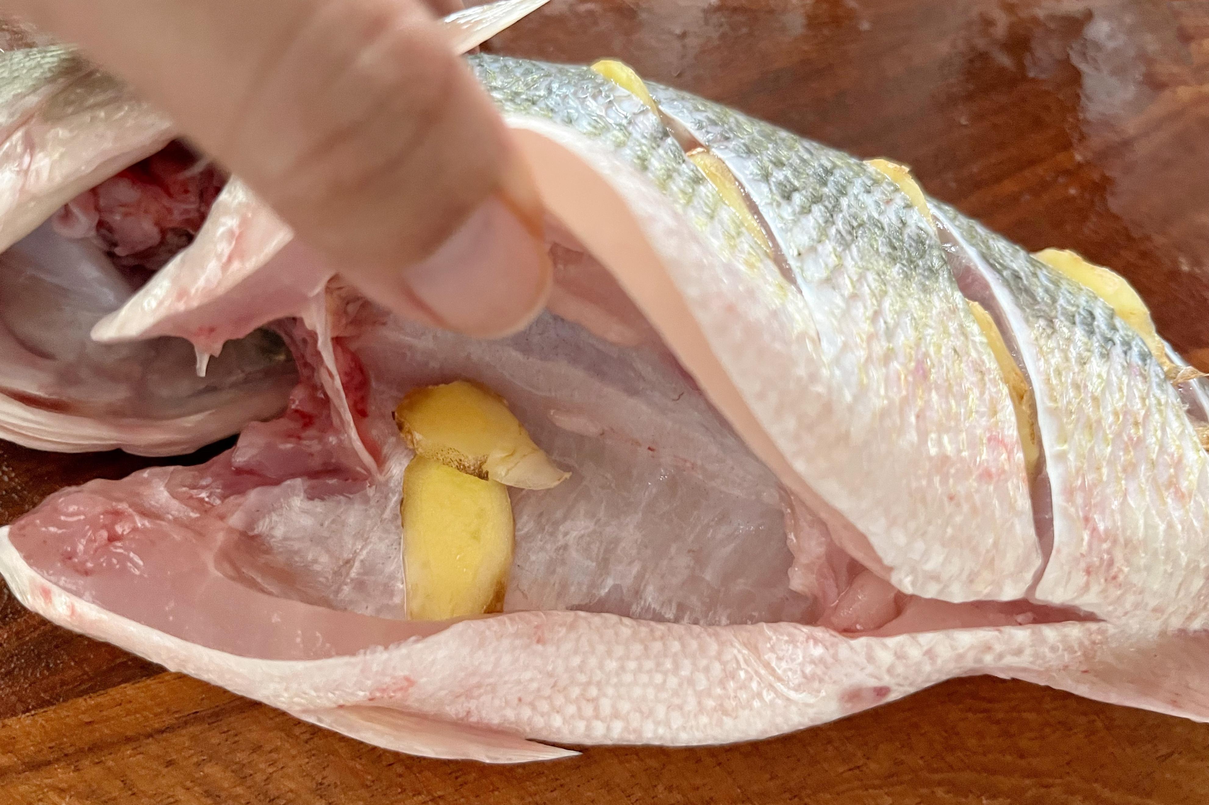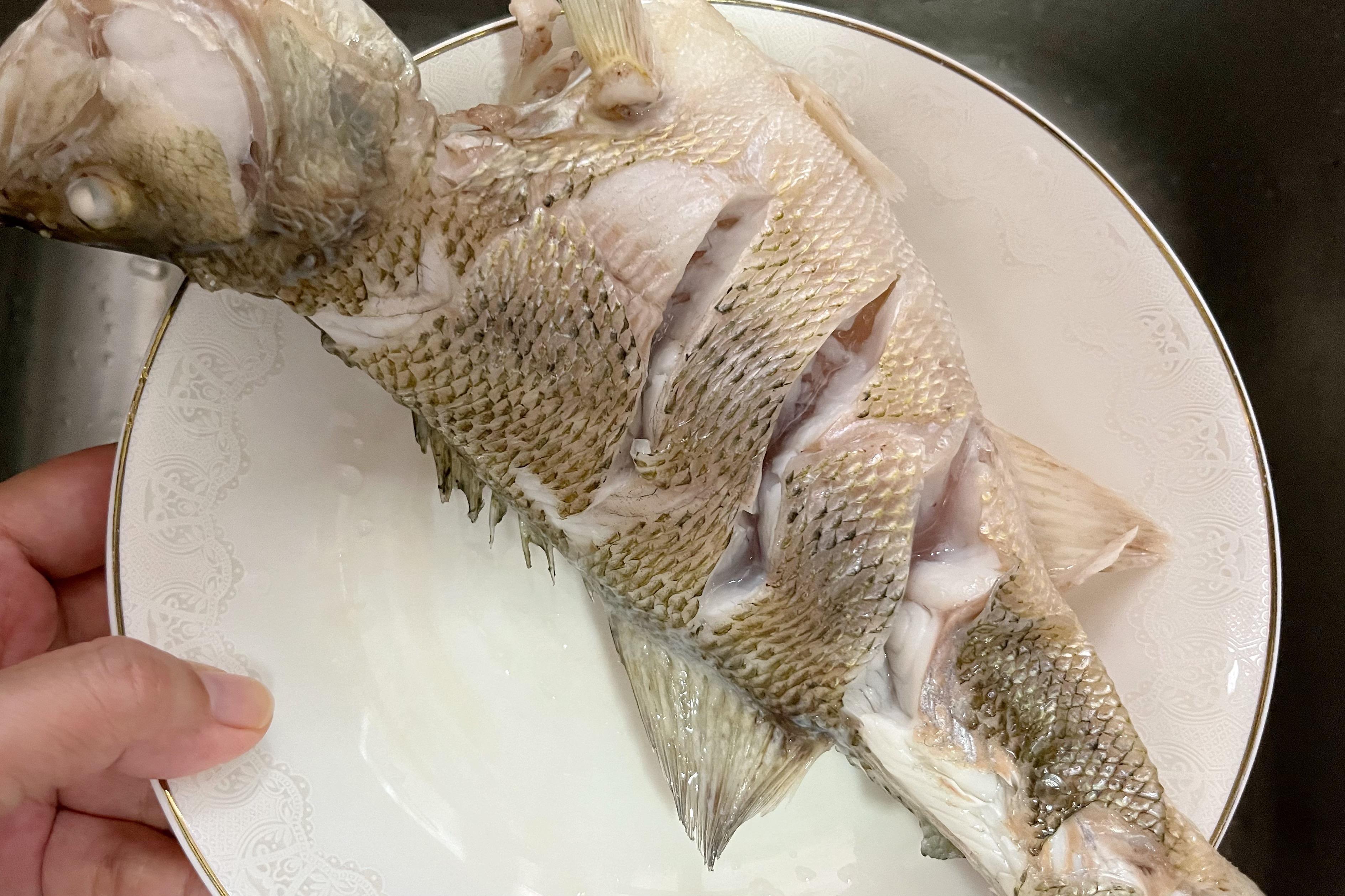 1、準備一條新鮮的鱸魚,將魚清理乾淨後,在魚身上抹一遍料酒,表面劃花刀,塞入薑片,醃製30分鐘去腥;