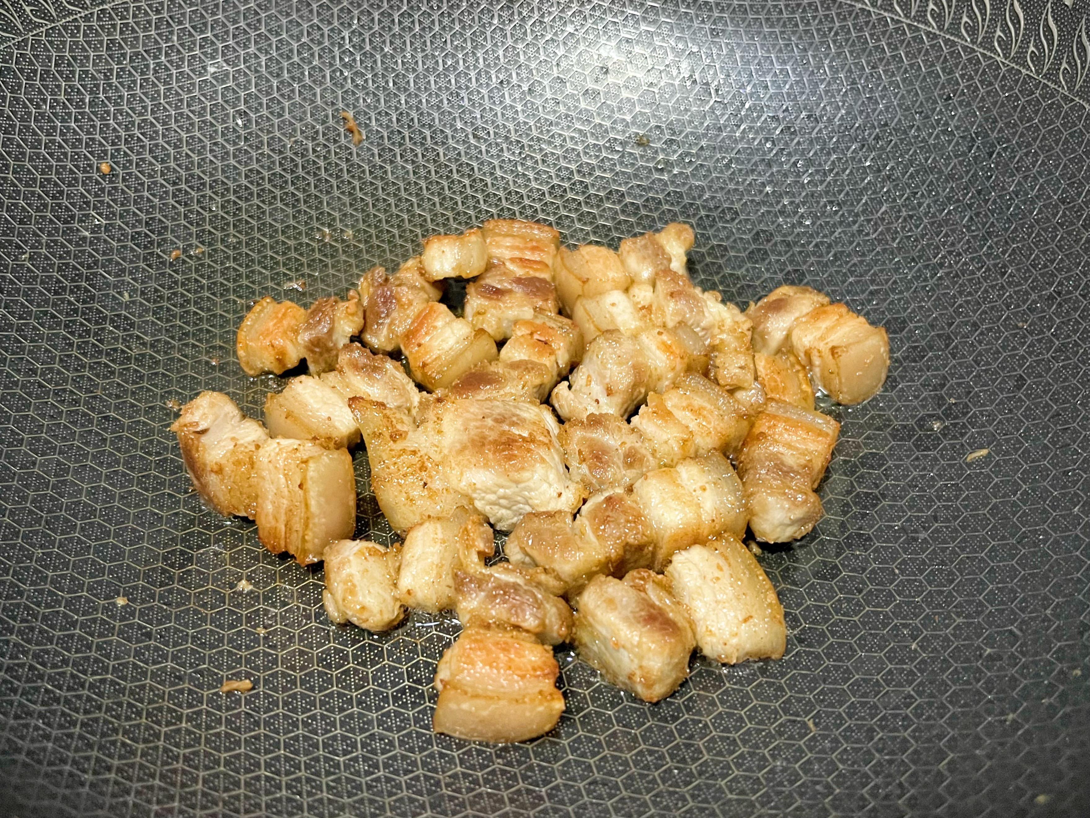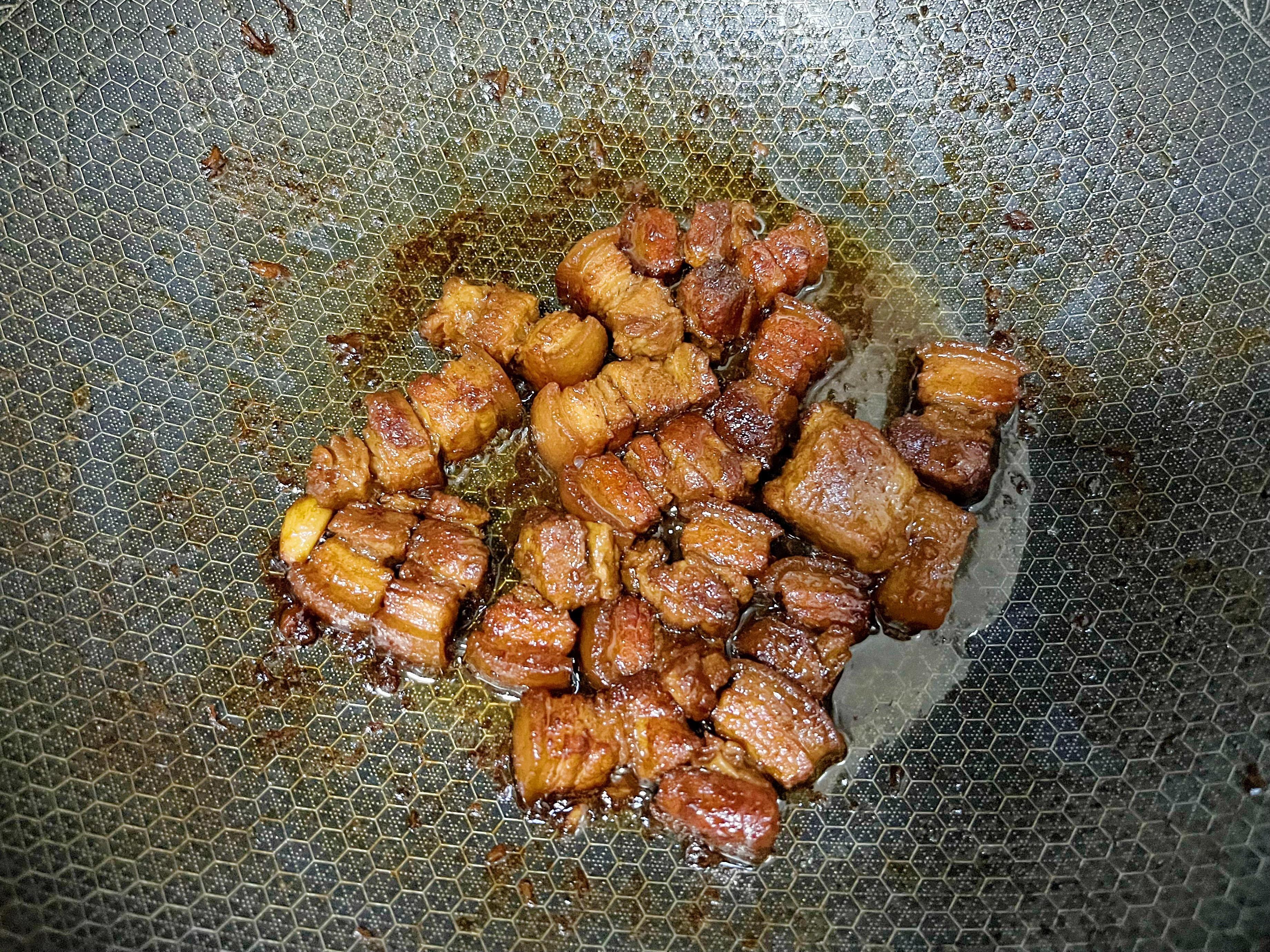 2、鍋中無需加油,倒入五花肉,小火慢慢煸炒出油脂,再加些冰糖進去炒化;