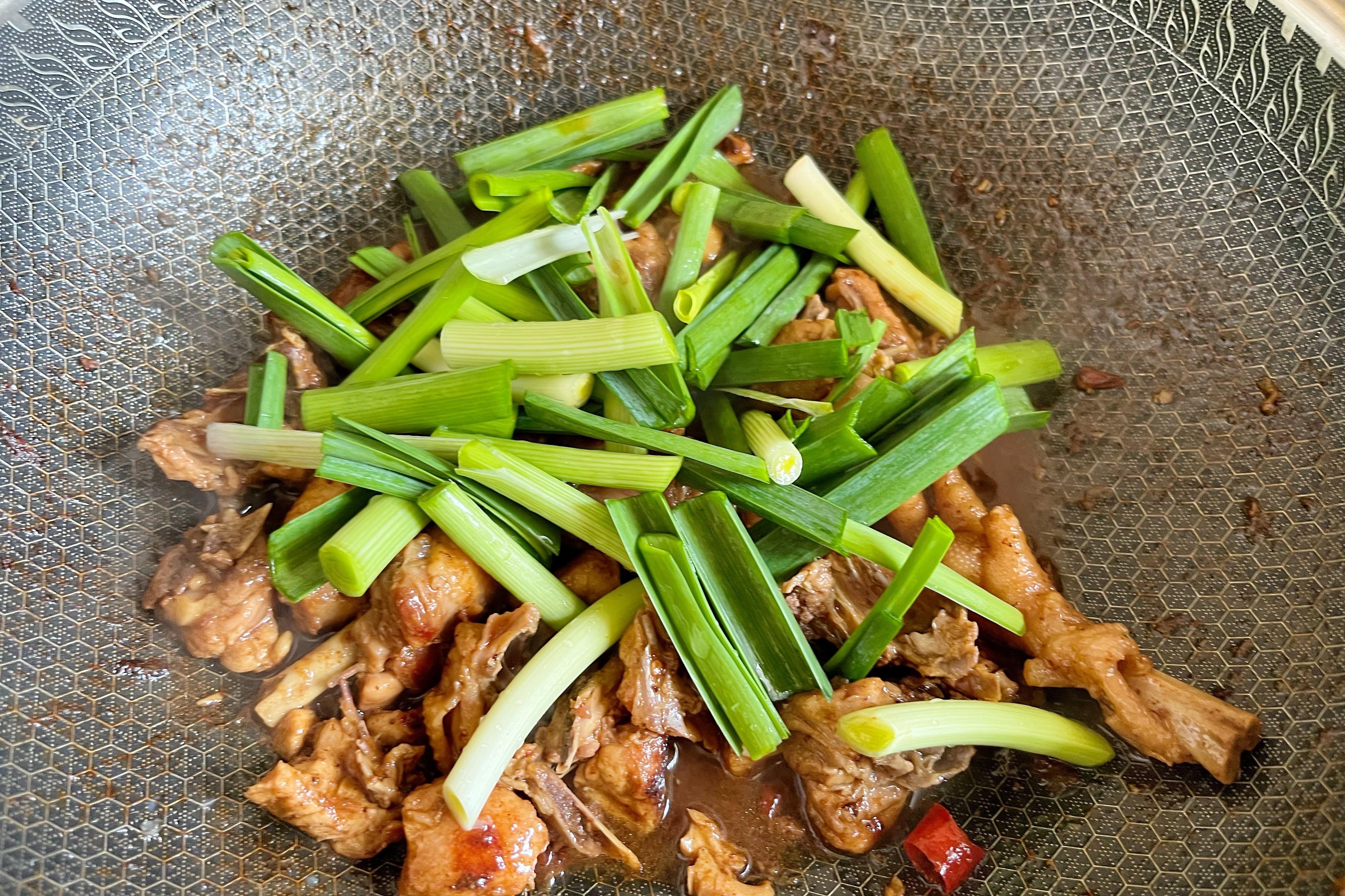 6、等鍋中汁水差不多收幹後,加入蒜苗,大火翻炒3分鐘,即可出鍋享用。