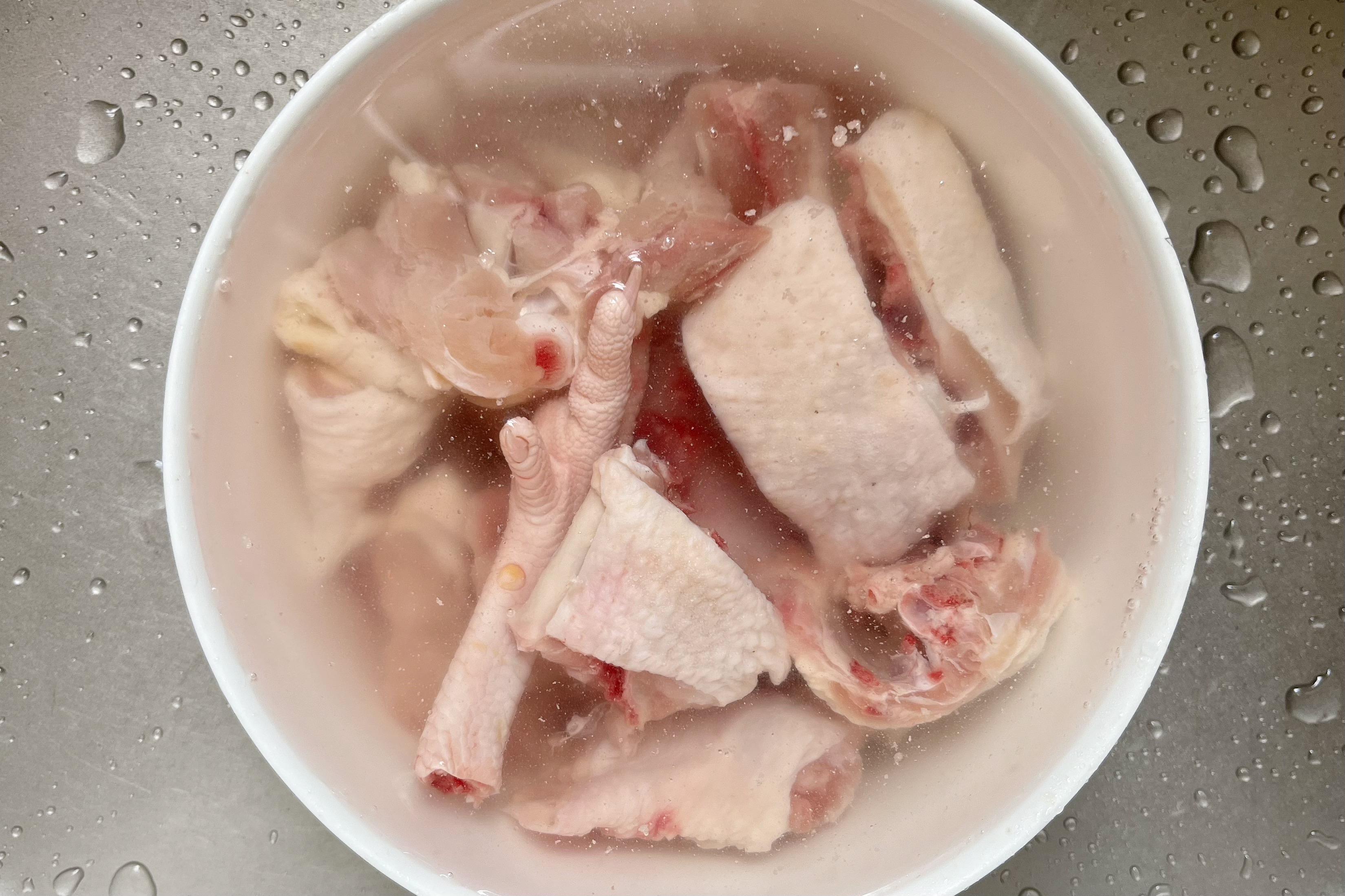 1、雞肉洗淨斬小塊,放入淡鹽水中浸泡1個小時,蒜苗洗淨切小段;