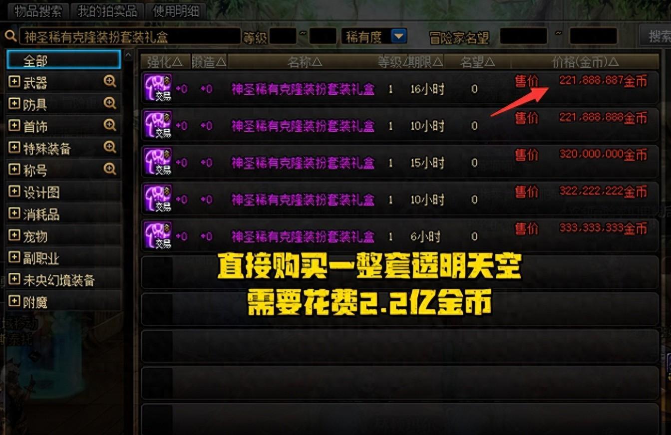 首先,如果在拍賣行搜索【稀有克隆裝扮套裝禮盒】,也就是俗稱的一整套透明天空,售價大概在2.2億金幣左右。