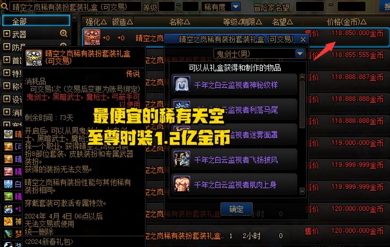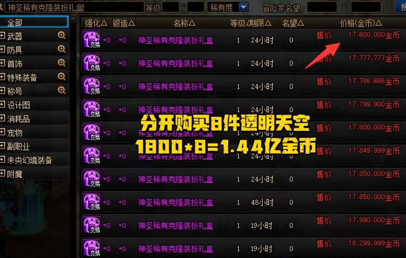 但是,重點來了,如果在拍賣行搜索【稀有克隆裝扮禮盒】,也就是一件透明天空,售價僅爲1800萬左右。