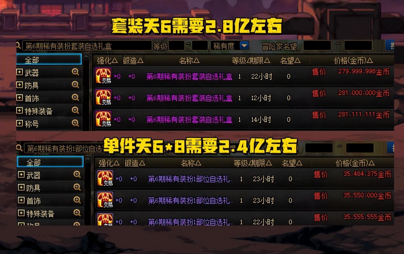 如果直接購買一整套“天6”,那麼需要花費2.8億左右金幣,但如果購買“單件天6”,每一件只需要3000萬左右。