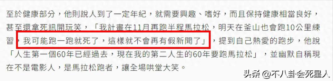 年近70歲還能跑馬拉松確實證明了他在同齡人中的優勢,不過周潤發對自己的成績還不滿意,稱比預期慢了4分鐘,還說會繼續跑步,希望能跑到90歲,這個毅力也讓人佩服。