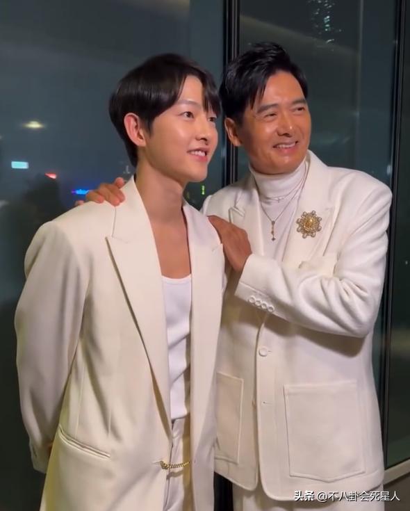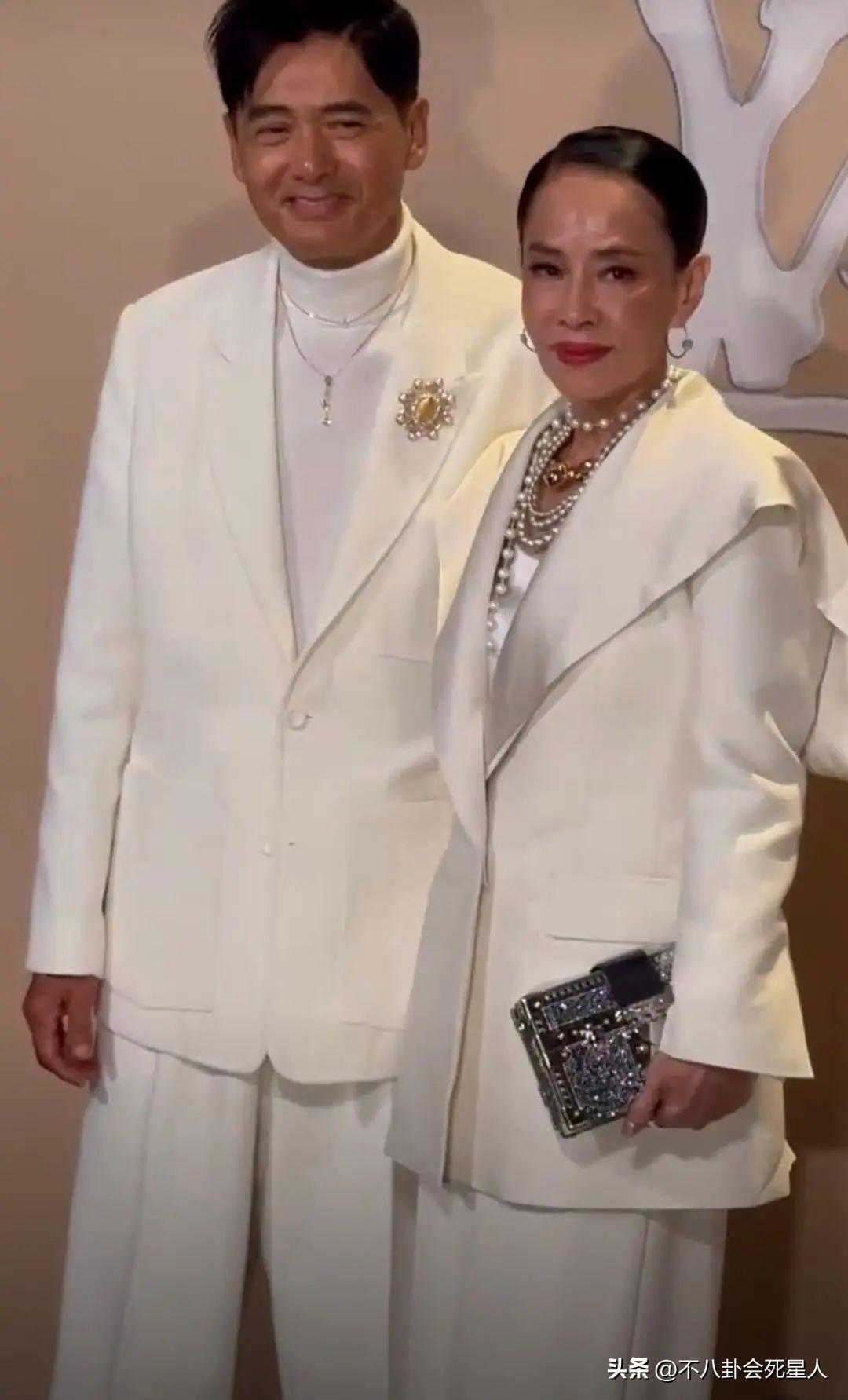 前段時間,周潤發夫妻出席某活動,穿着寬鬆白西裝的周潤發就顯得年輕很多,因爲西裝不會暴露他過度消瘦的身材,加上他本身頭髮濃密個子高,又回到了年輕時那個意氣風發的“發哥”了。