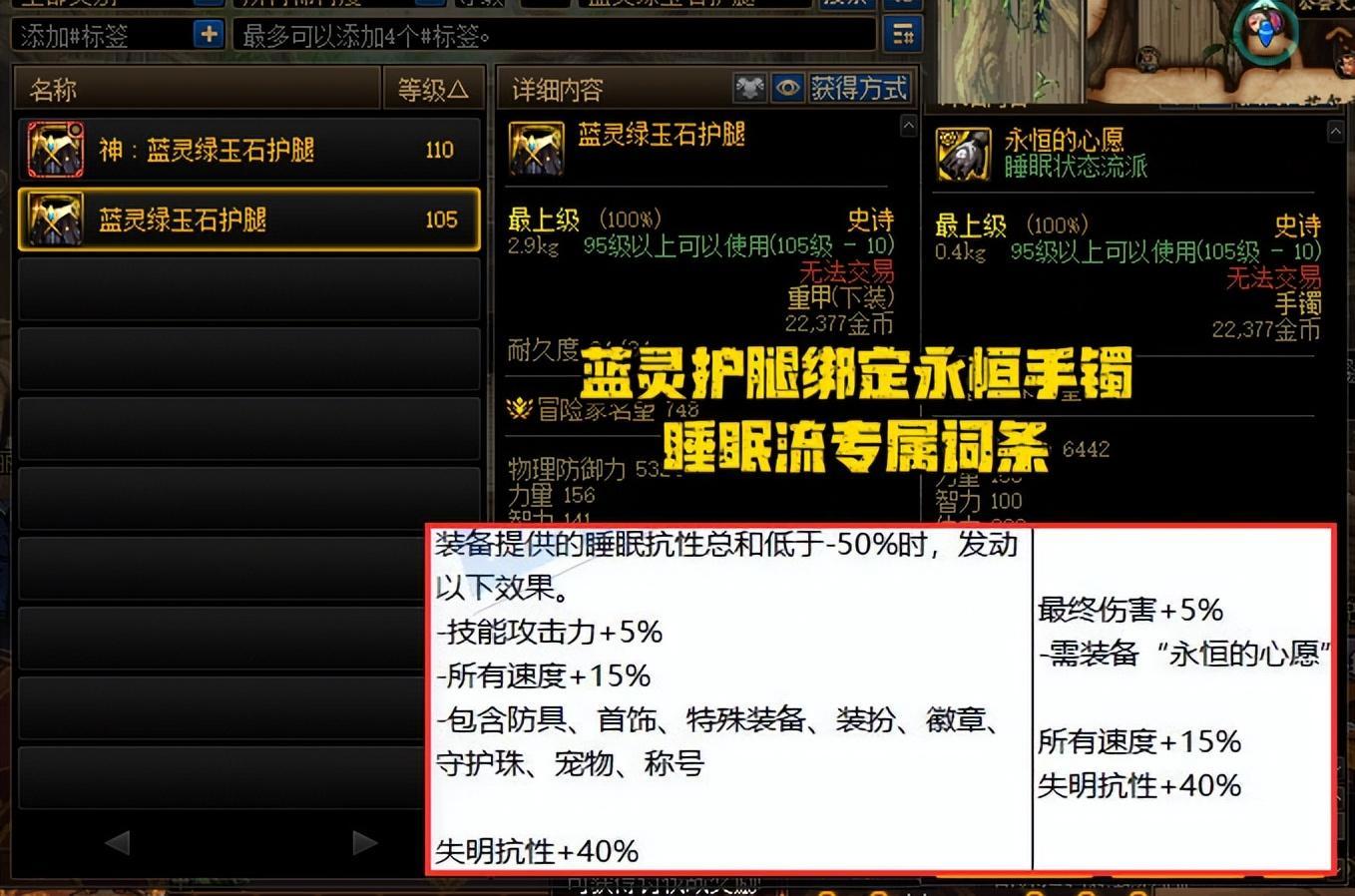 【10】藍靈護腿,“睡眠抗性低於-50%時,增加技攻和速度”,改版後“需搭配永恆心願、最終傷害+5%、所有速度+15%”。