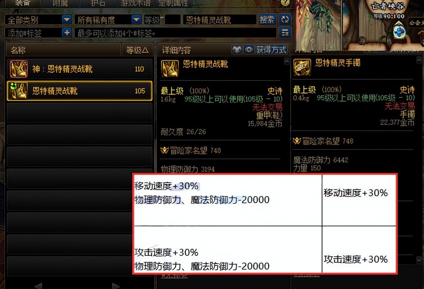【6】恩特鞋子,“移動速度+30%、防禦力-20000”,改版後“移動速度+30%”。