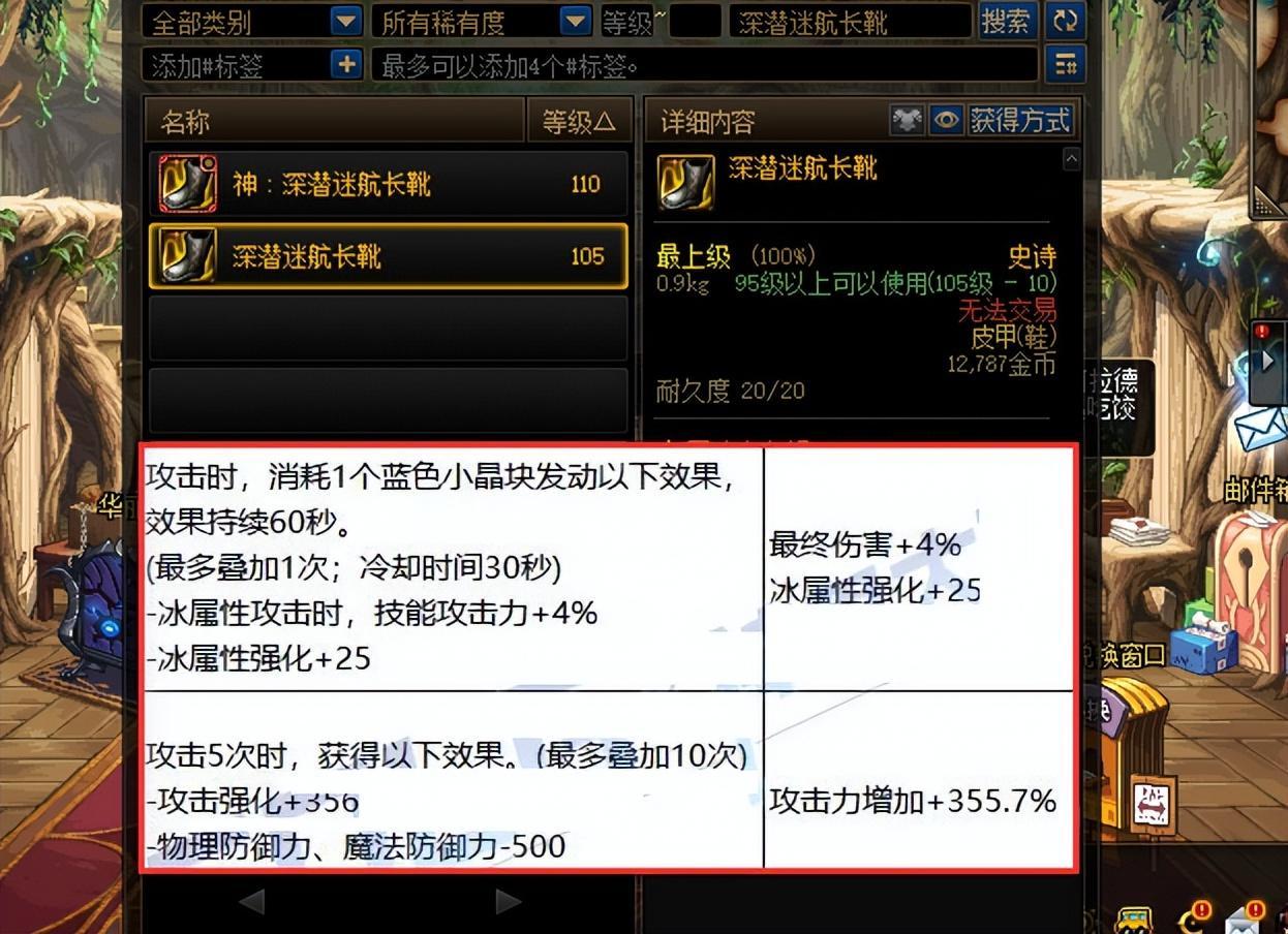 【8】深潛鞋子,改版前“消耗藍色小晶塊增加技攻和冰屬強”,改版後“最終傷害+4%,冰屬性+25”。