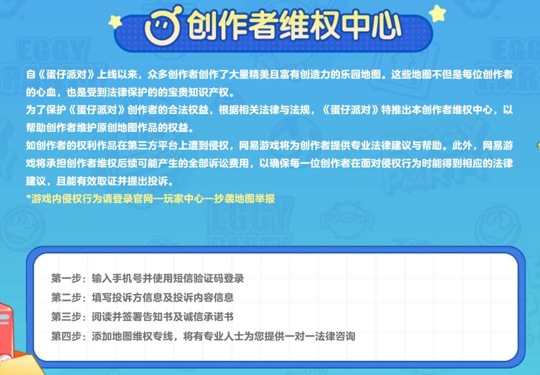 最後值得一提的是,搞定“原創激勵“”原創助力“之後,《蛋仔派對》也再次加固了”原創保護“,進一步完善了內容生態運營閉環。本次品牌煥新中,官方正式上線了創作者維權中心,一旦遭遇第三方平臺地圖抄襲侵權,創作者能夠直接由此發動維權申請,並得到官方專業的法律建議與幫助,甚至於一對一的法律諮詢服務。