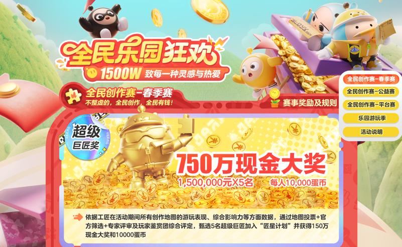 至於如何激勵玩家創作?除了滿足人類天生的表達分享慾望,官方亦爲優秀創作者提供了一個“名利雙收”的美好願景。從“名”而言,蛋仔以極高的頻率舉辦各式大小型地圖創作賽事以及線上線下交流活動,不少優秀的“明星工匠”、“明星地圖作品”由此脫穎而出,更多的小白創作者獲得了更多成長與交流的空間。從“利”而言,遊戲此前就宣佈了“共創蛋時代”計劃,預計兩年投入5億元普惠蛋仔創作者,在剛剛公佈的“全民樂園狂歡”中,也再次進行福利與普惠範圍的加碼,攏共包含了1500萬元現金獎勵,激勵地圖創作者、遊玩者、平臺傳播者都能在活動期間的不同賽道贏取屬於自己的高額獎勵。