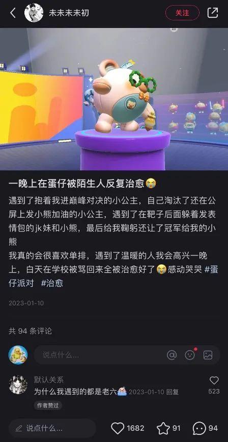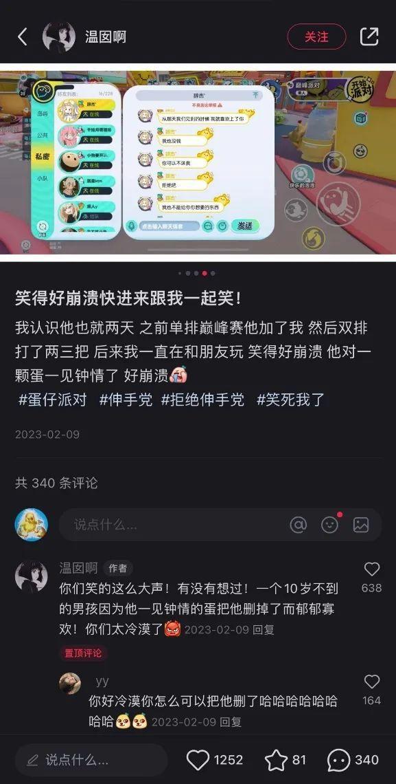 但《蛋仔派對》不一樣。因爲幾乎不受限的玩法設計和遊戲主題,玩家從蛋仔中獲取的樂趣並非來自“玩遊戲就是爲了贏“,而是取決於一種新鮮的社交、生活體驗。它可以是家長帶着寶寶蛋參加比賽反被寶寶蛋教學,也可以是在廣場上和陌生蛋仔抱了一抱,可以是被一場雪美到失語,也可以是被一個故事震撼到無言。”體驗“這件事是不需要門檻的,而每個人的生活,以及對生活的感知亦是獨一無二的,正因如此,《蛋仔派對》的內容創作與傳播進一步去權威化,每位普通玩家的分享都更有可能被感知被共鳴。