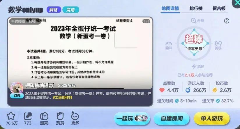 當然,還有一類大巧不工的作品,看似普通,卻具備着某種樸素的震撼人心的力量——比如《數學onlyup》,只靠白紙黑字的單調封面就深深“觸動”無數蛋仔,不少人甚至感慨“玩過最恐怖的圖都沒這個嚇人”。