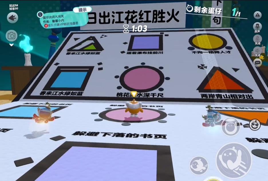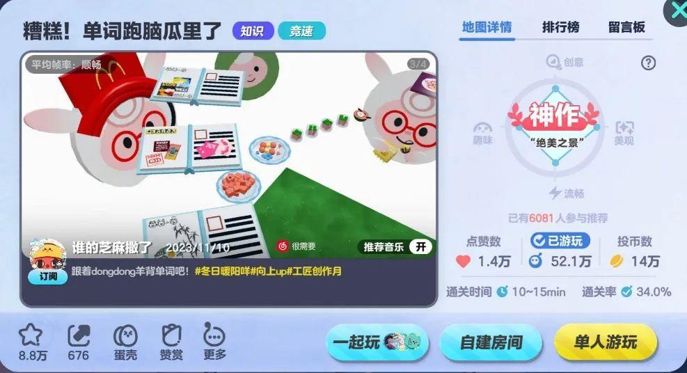 比如發佈至今不到兩個月便獲得17萬點贊、278萬遊玩人數的《蛋仔詩詞大闖關》,蛋仔需要在快速下落的書頁間閃展騰挪,一邊回憶古詩一邊找準落腳點,儘可能存活至最後獲得勝利。