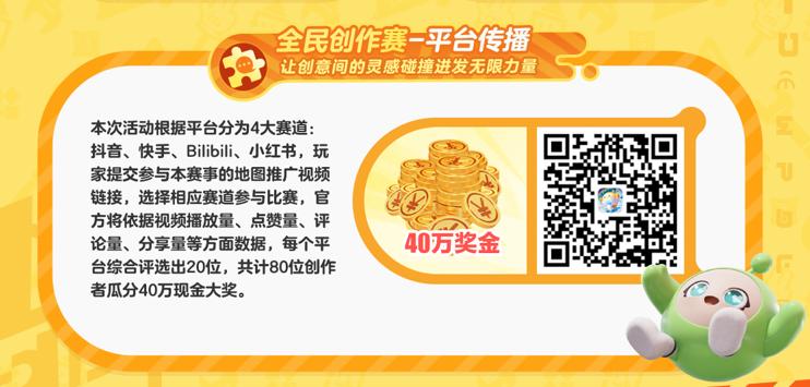 遊戲官方也意識到了這一點,比起商業化氣息濃厚的廣告“恰飯”,普通玩家真誠的遊玩體驗、經歷故事,顯然更具備打動人心的力量。在“全民樂園狂歡”活動中,40萬現金大獎將被分配給優秀的地圖推廣視頻創作者。這是一場真真正正的“全民狂歡”,囊括了創作者、遊玩者、傳播者全體玩家,或者換種說法,所謂的“傳播者”,根據自己的遊戲體驗在社交媒體上輸出觀點、分享感受,這又何嘗不是一種形態的“創作者”呢?