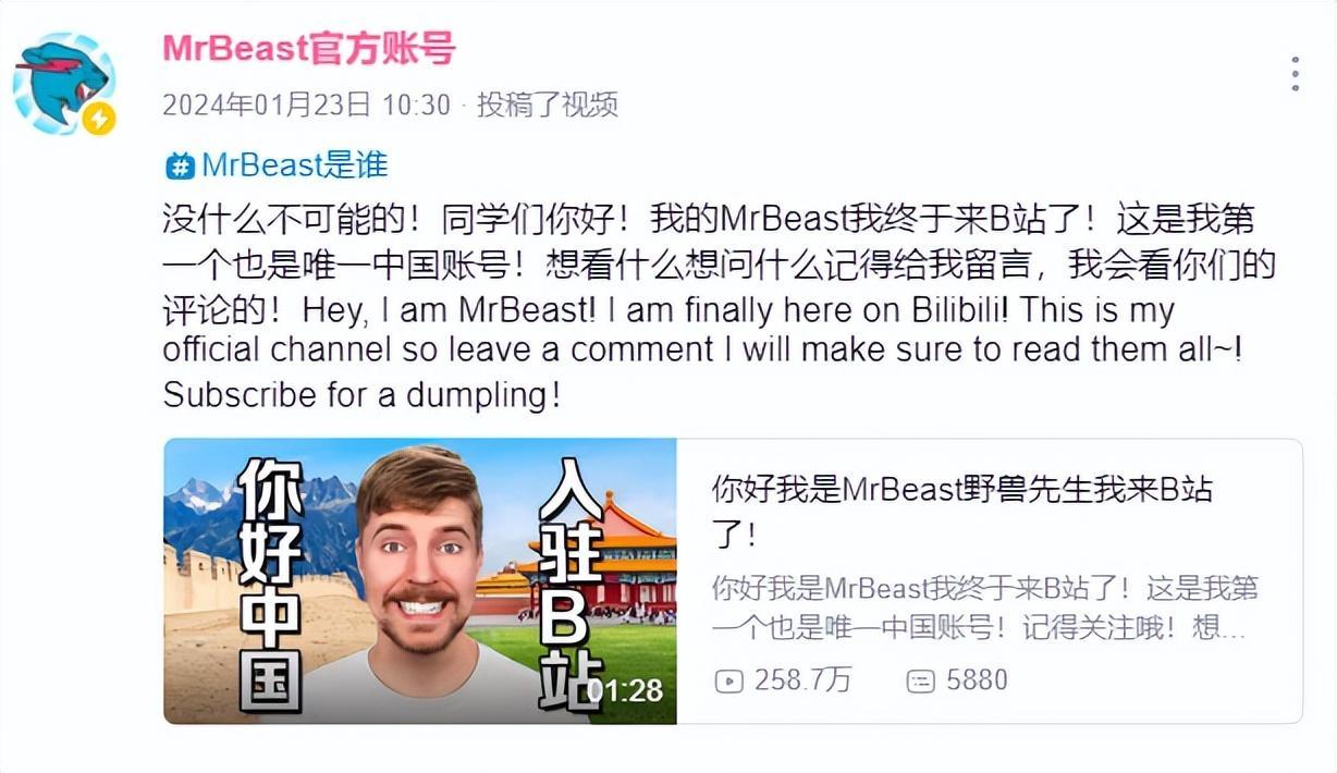 今日,Youtube頭號網紅、頻道共計2.5億訂閱量的海外博主MrBeast,在B站其官方頻道宣佈入駐B站。