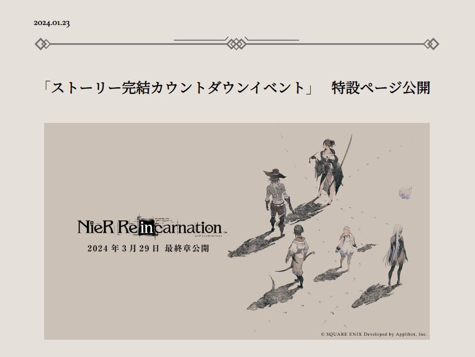 由Applibot開發,SE發行的RPG手遊,《尼爾》系列首部手遊《尼爾:轉生》(NieR Re[in]carnation)即將停服,SE網站和遊戲官博都發布了“故事完成倒計時活動”特別頁面。