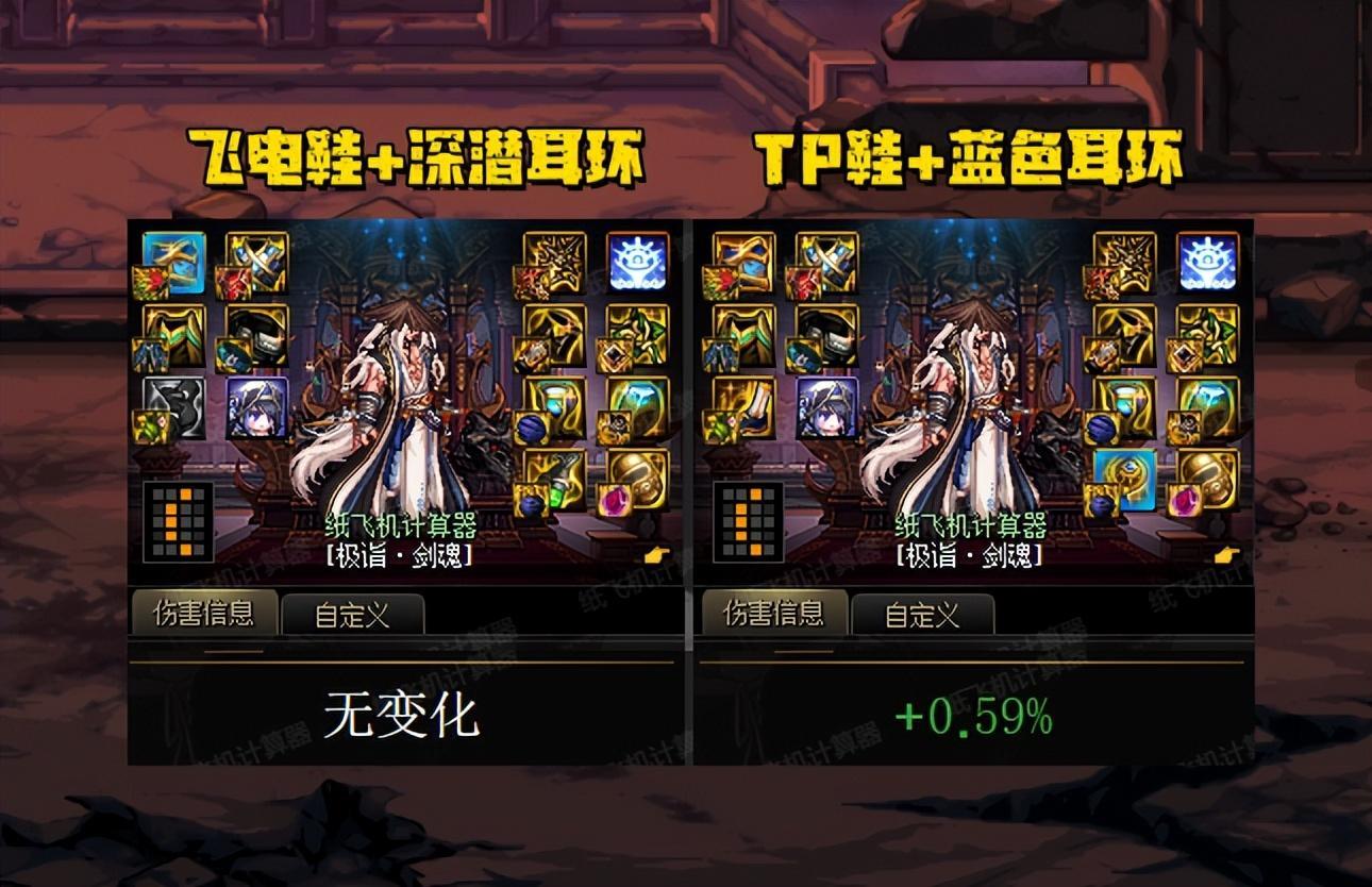 「藍色耳環+TP鞋子」VS「深潛耳環+飛電鞋子」,此時,前者傷害高了0.6%左右!(大技能佔比越高,藍色耳環提升就越大)