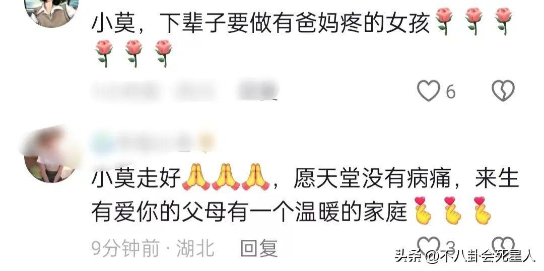 還有人說他們把小莫當成搖錢樹,冷漠到了極點。願小莫一路走好,下輩子出生在有父母疼愛的家庭裏。