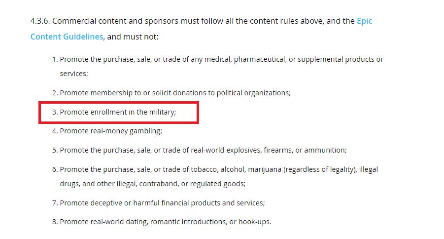 創作系統的高自由度,使得《堡壘之夜》經常被各行各業的商家用作促銷工具。但英國陸軍很可能會喫閉門羹,因爲根據Epic的創作者指南,由用戶製作的內容“不得提倡入伍”,而“行動:歸屬”帶有顯而易見的徵兵宣傳意味。