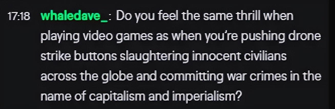 “當你玩遊戲時,你是否會感到與按下無人機攻擊按鈕,在全球範圍內屠殺無辜平民,並以資本主義和帝國主義的名義犯下戰爭罪行時一樣的興奮感?”
